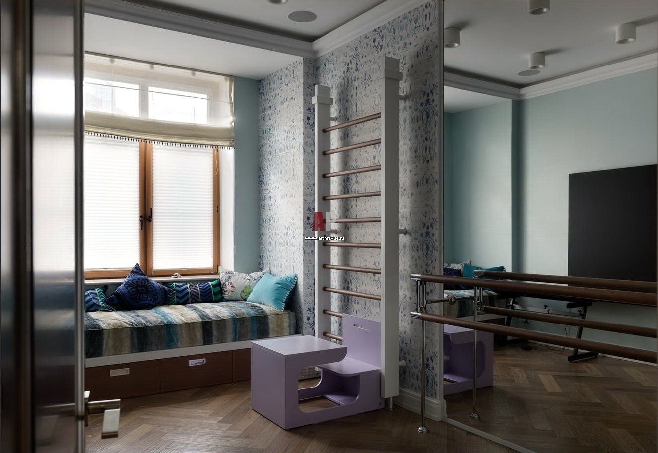 Интерьер детской комнаты со спортивными снарядами и станком для гимнастики и балета.