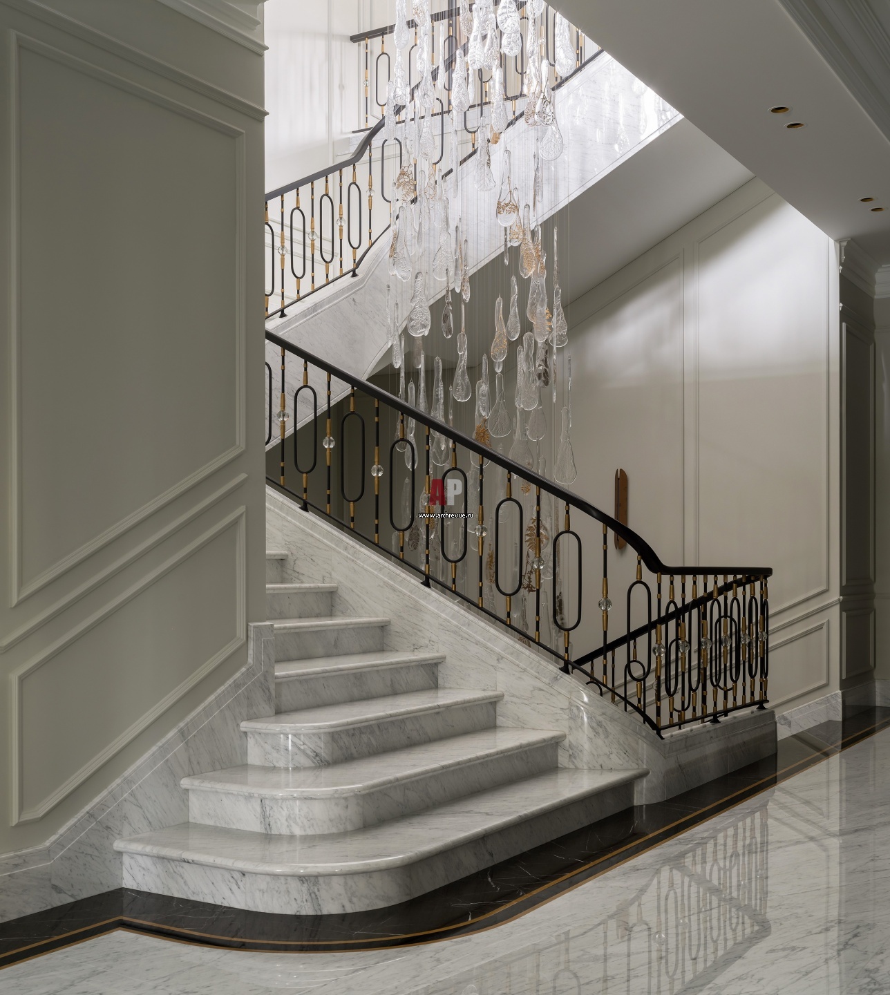 Белоснежная каменная лестница украшена тонким металлическим ограждением с хрустальными балясинами.