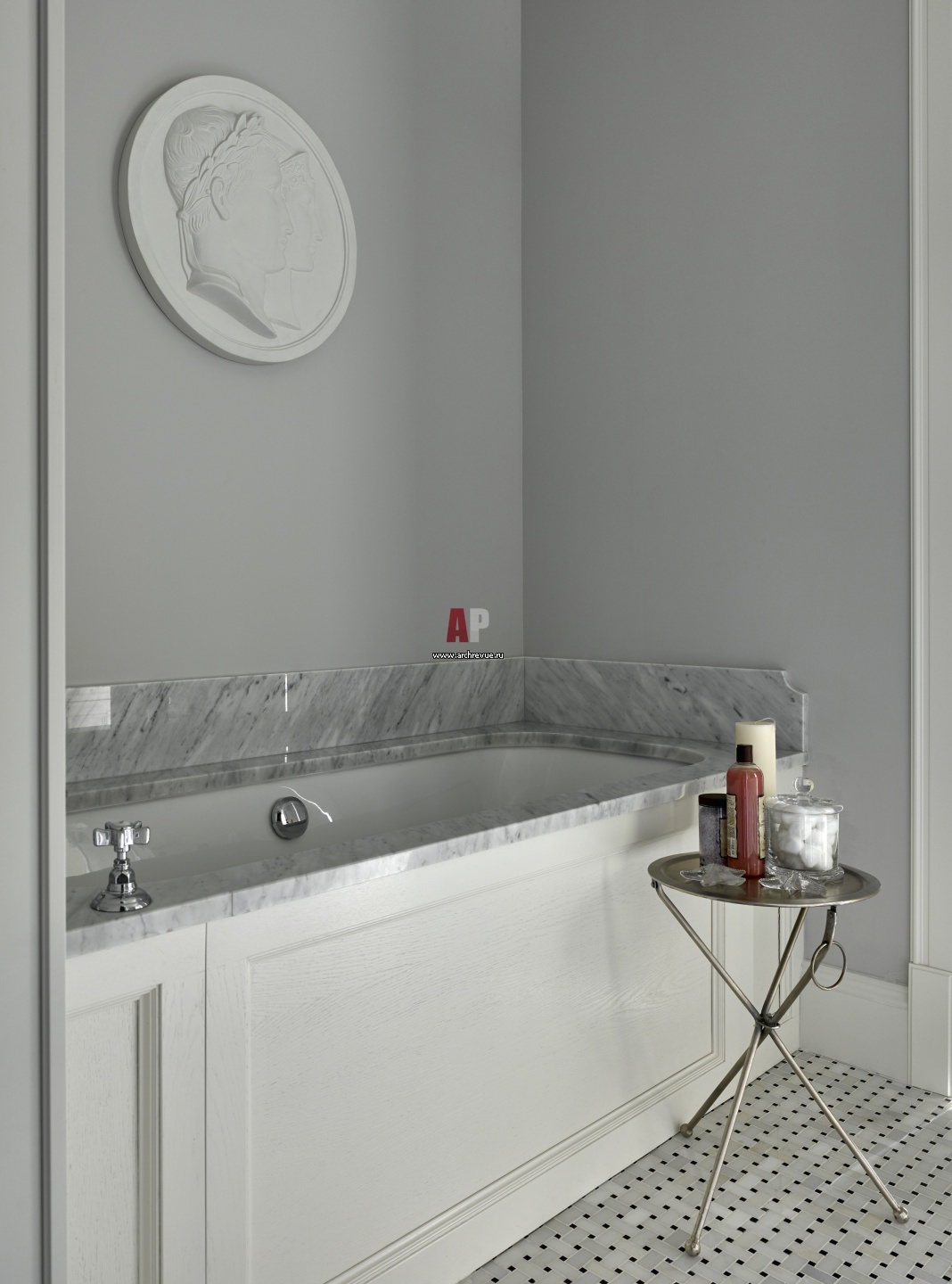 Интерьер хозяйской ванной. Стена оформлена гипсовым медальоном с античной тематикой.