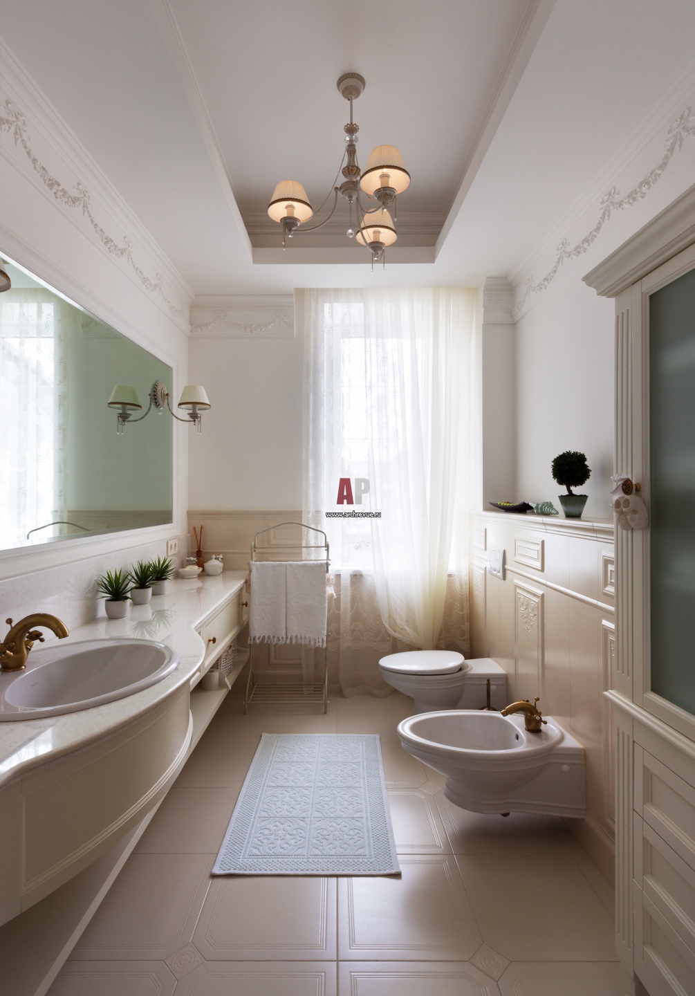 Фото интерьера хозяйской ванной комнаты в неоклассическом стиле. Низ стен зашит керамическими панелями, Petracer’s. Умывальник, Villeroy & Boch. Лепной декор с виньетками от Orac Decor (коллекция Orac Luxxus), поставщик «Ампир Декор».