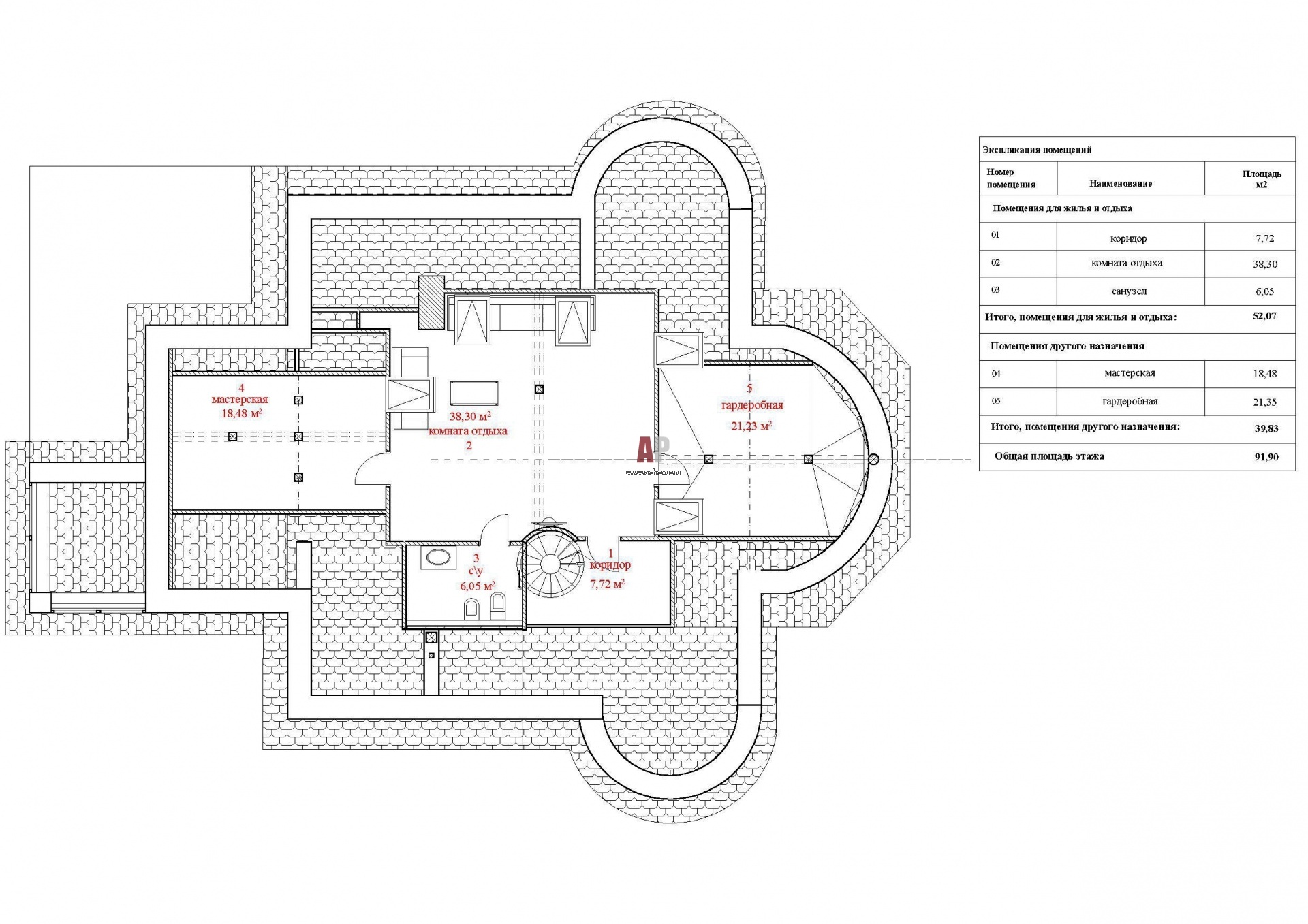 План третьего этажа трехэтажного дома с округлыми эркерами.