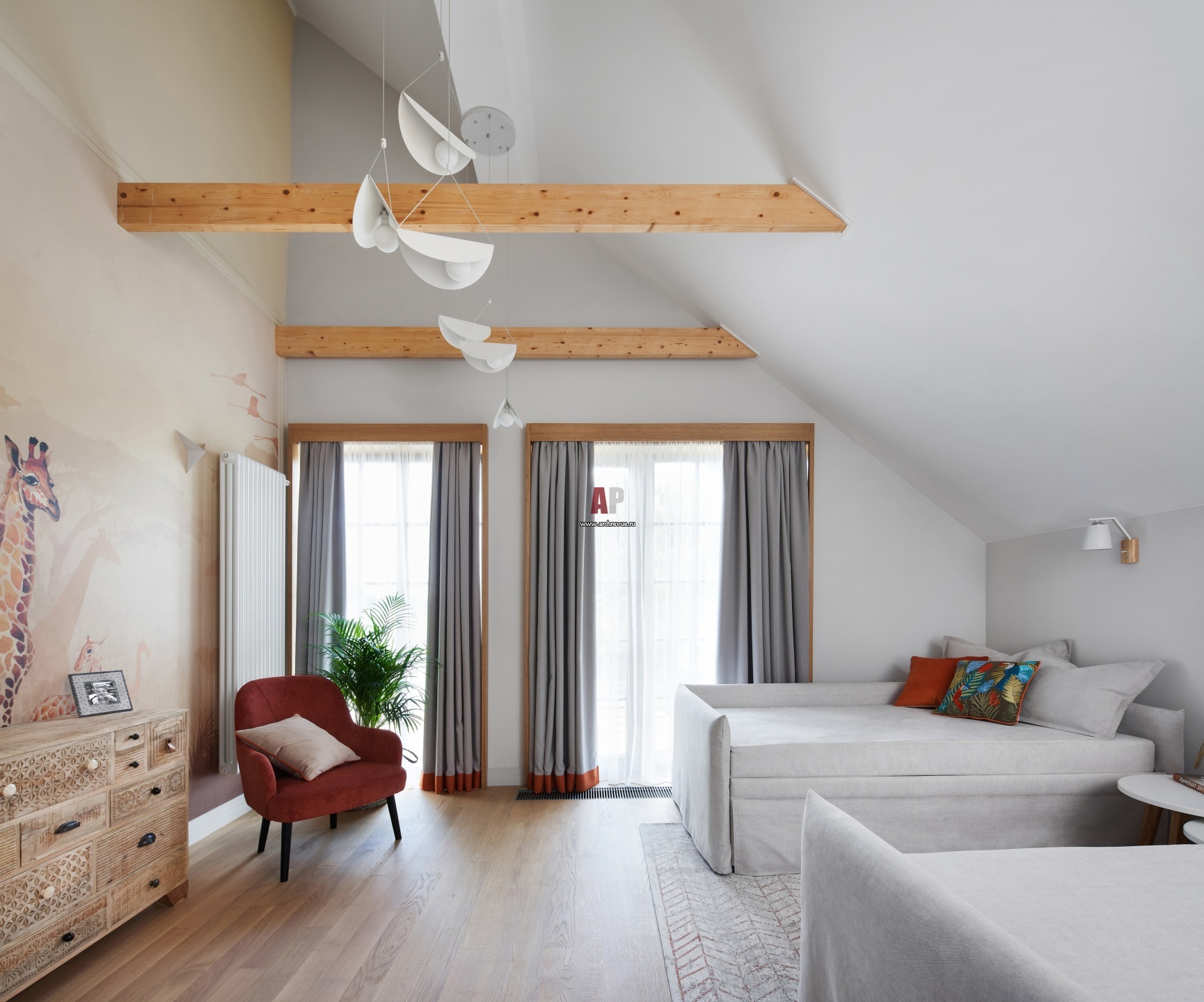 Детская спальня. Стену напротив кроватей украшает панно в стиле сафари. Кровати, Mexo Design. Комод, Kare Design. Кресло, Kaza do Sofa. Подвесные светильники, Lival, модель Glider.