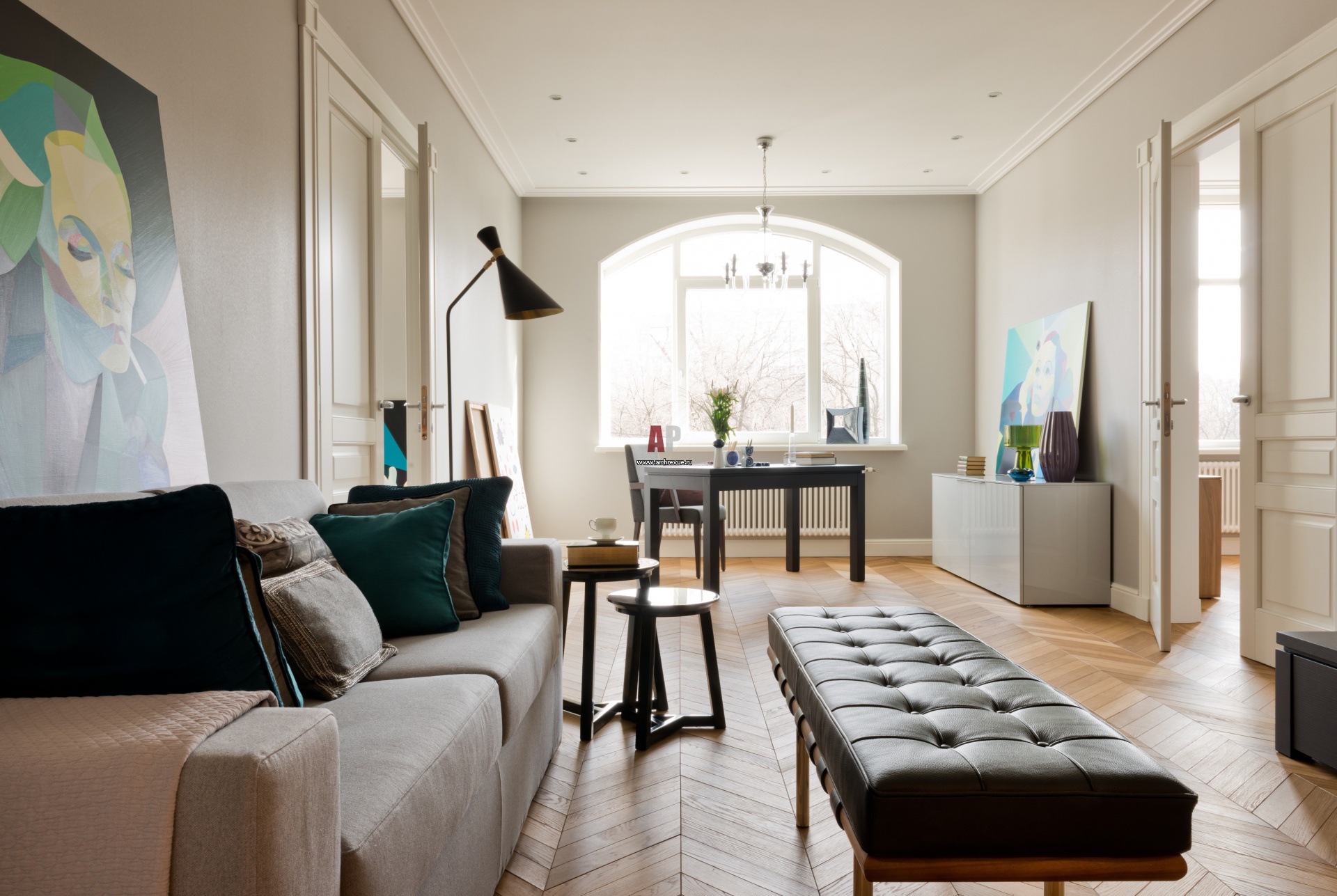 Смысловой центр квартиры – гостиная, откуда можно попасть в спальню и на кухню. Распашные двустворчатые двери в изолированные помещения выстроены на одной оси, что создает в ощущение сталинского дома с богатой истории. Арочное окно без штор сделано интерьерным акцентом.