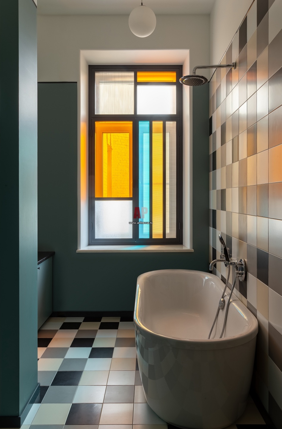 Интерьер квартиры галериста в Москве. Окно в ванной комнате закрыто художественным витражом с ярким авангардным рисунком. С геометричным витражом рифмуется керамическая плитка, которым выложены пол и стены.