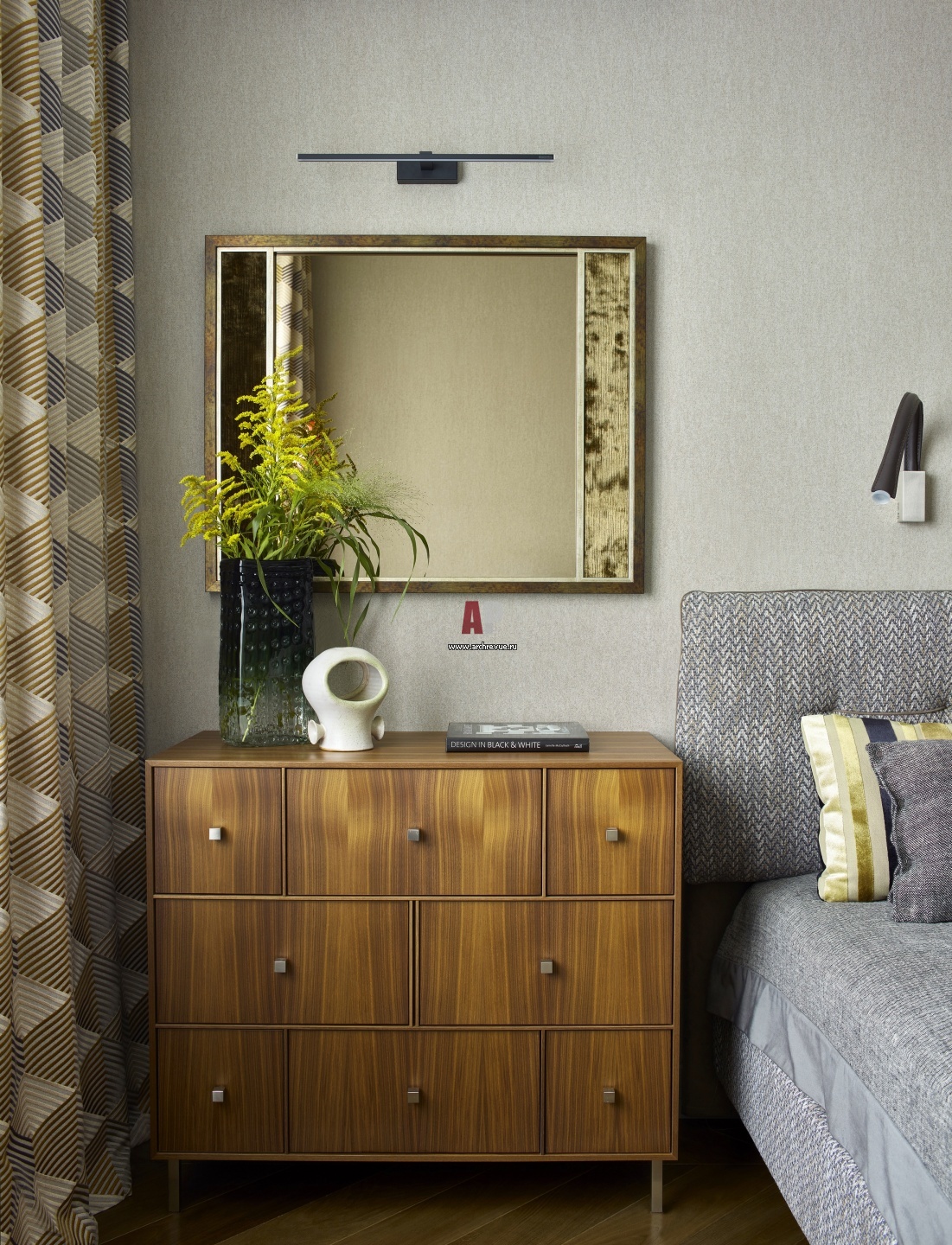 Стены в мужской спальне оформлены текстильными обоями с тактильной фактурой, Arte, коллекция Les Unis. Комод, Porada. Зеркала в мужской спальне сделаны на заказ.
