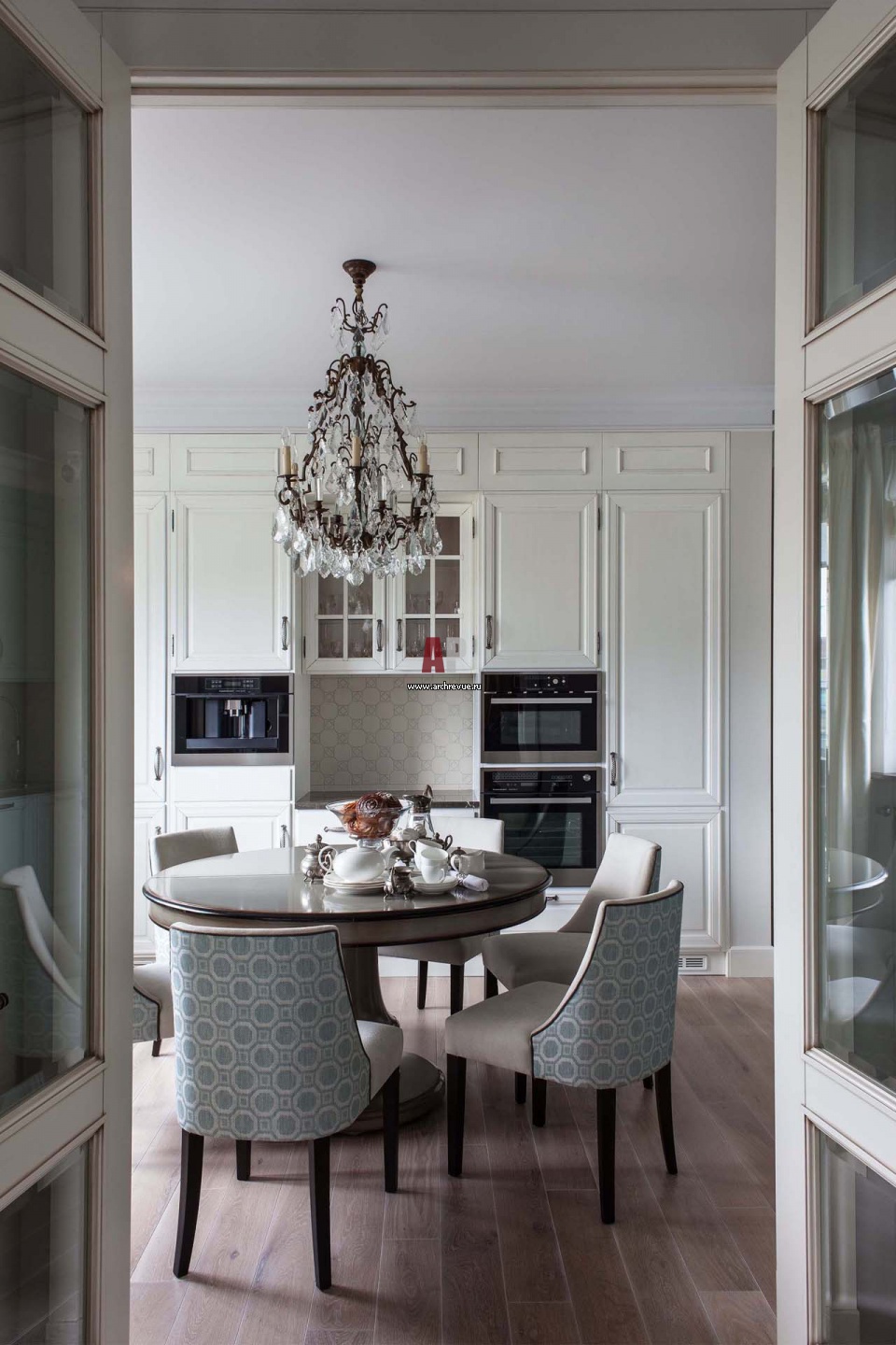 Интерьер столовой в пастельных бирюзовых тонах. Гостиная соединена с кухней-столовой большими распашными дверями. Если их закрыть, то получатся две отдельные зоны.