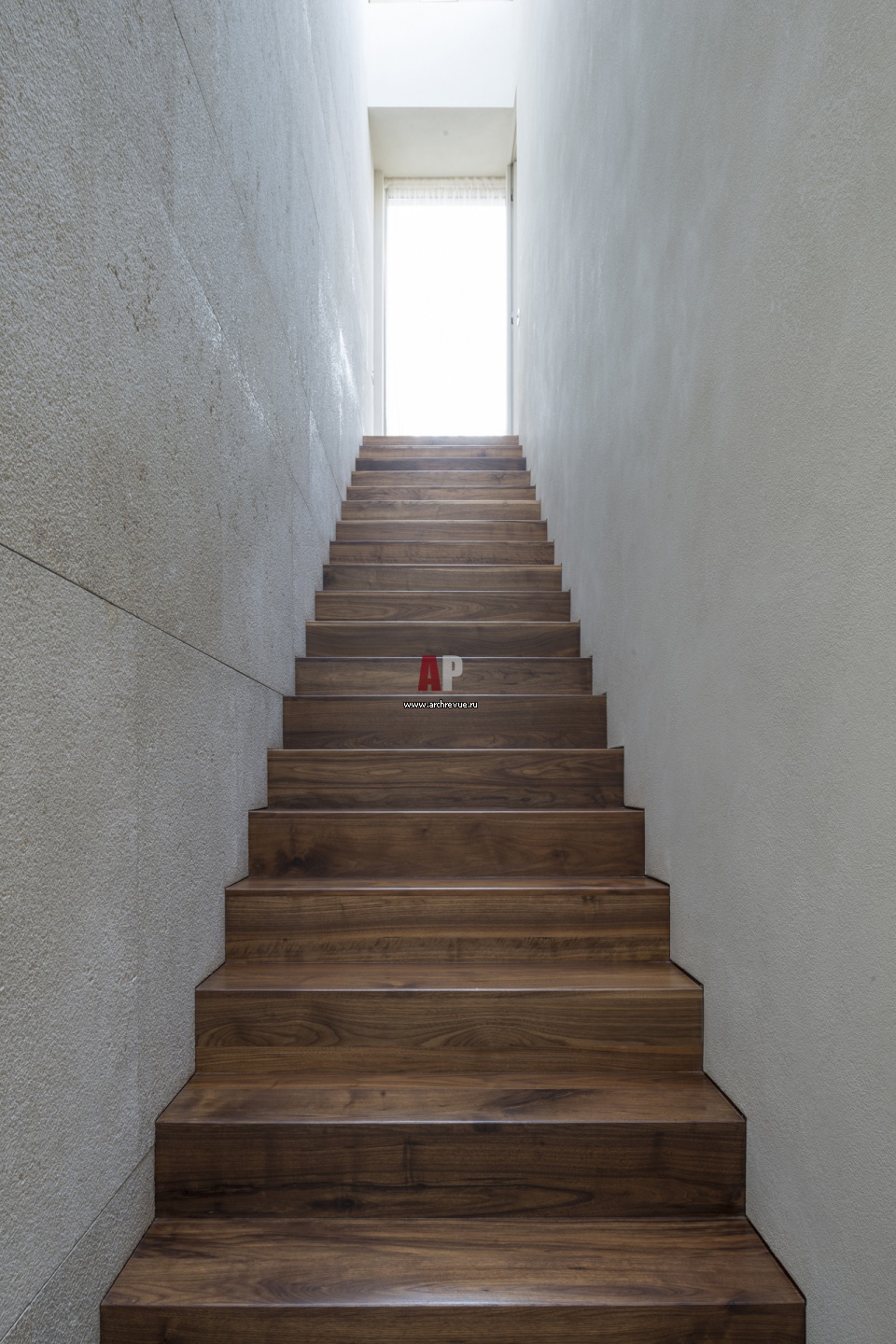 На фото – лестница на второй этаж. Стены облицованы каменными плитами, ступени –древесиной американского ореха.