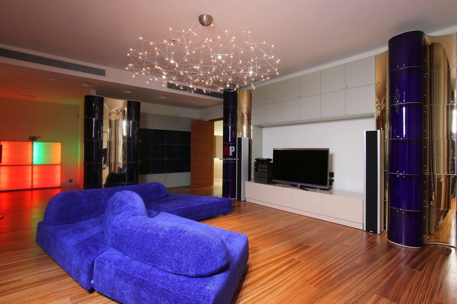 Интерьер домашнего кинотеатра в современном стиле. Над трансформирующимся диваном Edra светильник Quasar в виде звездного облака.