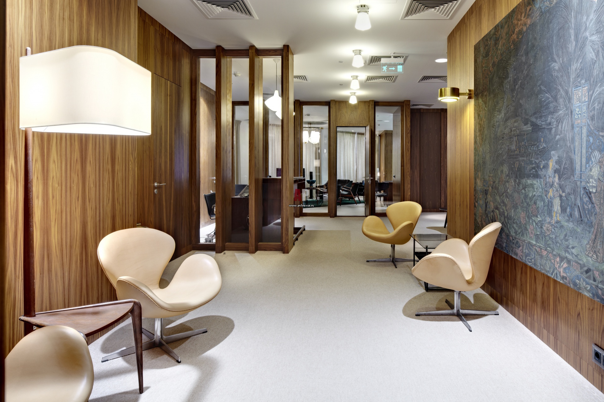 Интерьер приемной представительского офиса в стиле ретро. Кресла «Лебедь» по дизайну Арне Якобсена раритетные, они отличаются от тех, что выпускают сегодня.
