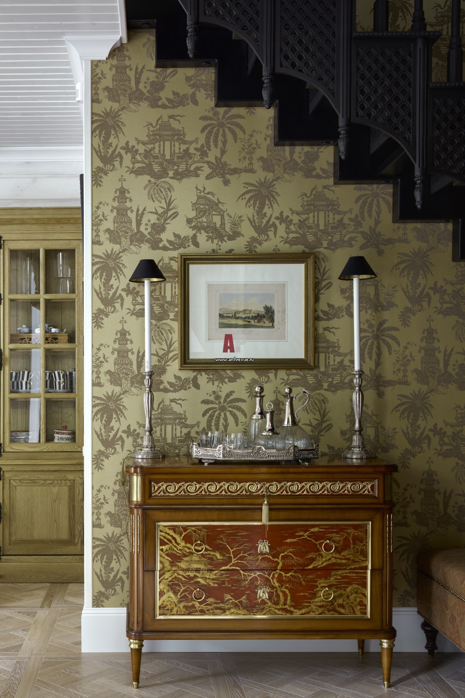Холл первого этажа. На стене – золотистые обои с орнаментом на китайскую тему. Комод, Salda.