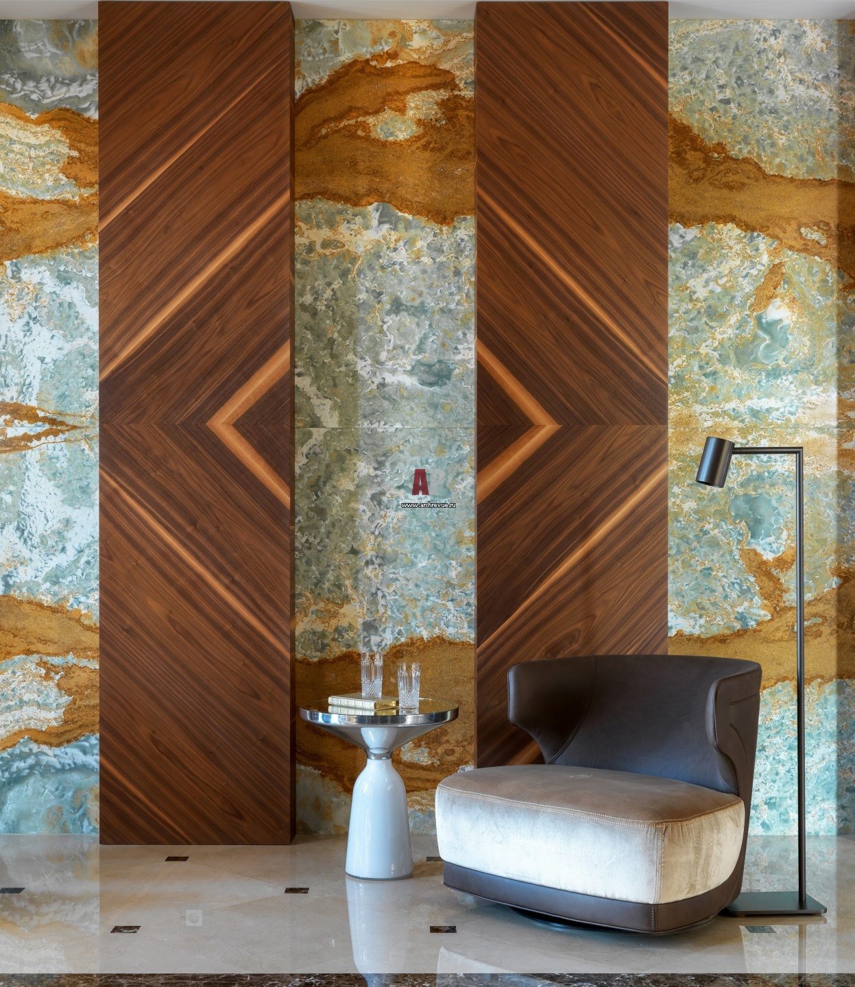 В проходной зоне от входного холла до гостиной пилоны оформлены шпонированый орехом, а ниши – ониксом с подсветкой.
