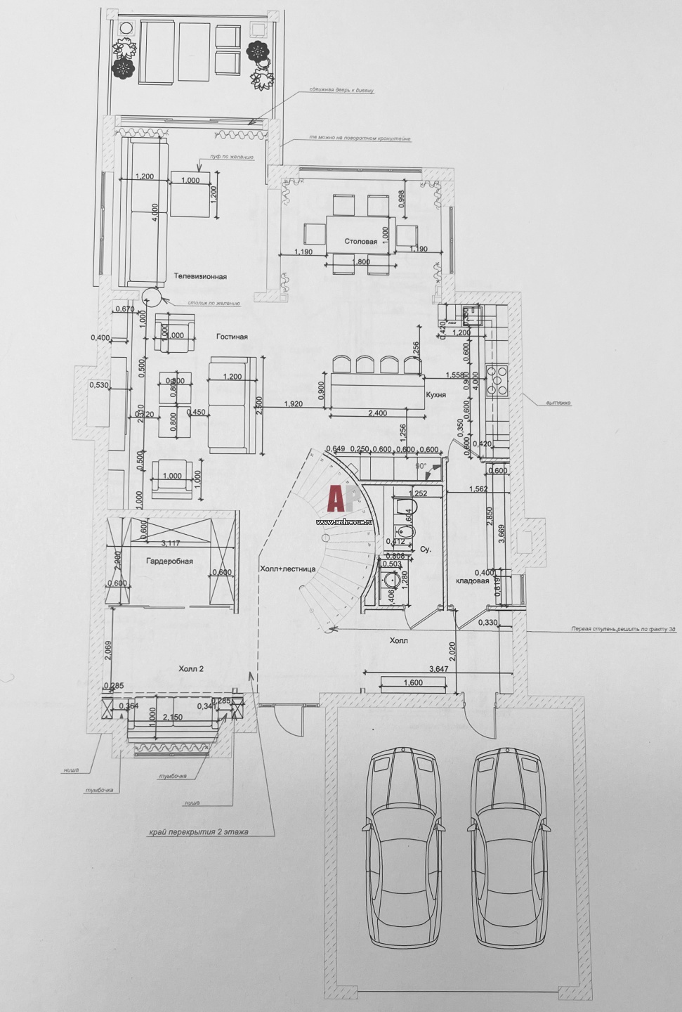 Планировка 1 этажа 3-х этажного современного дома в поселке «Новые Вешки».