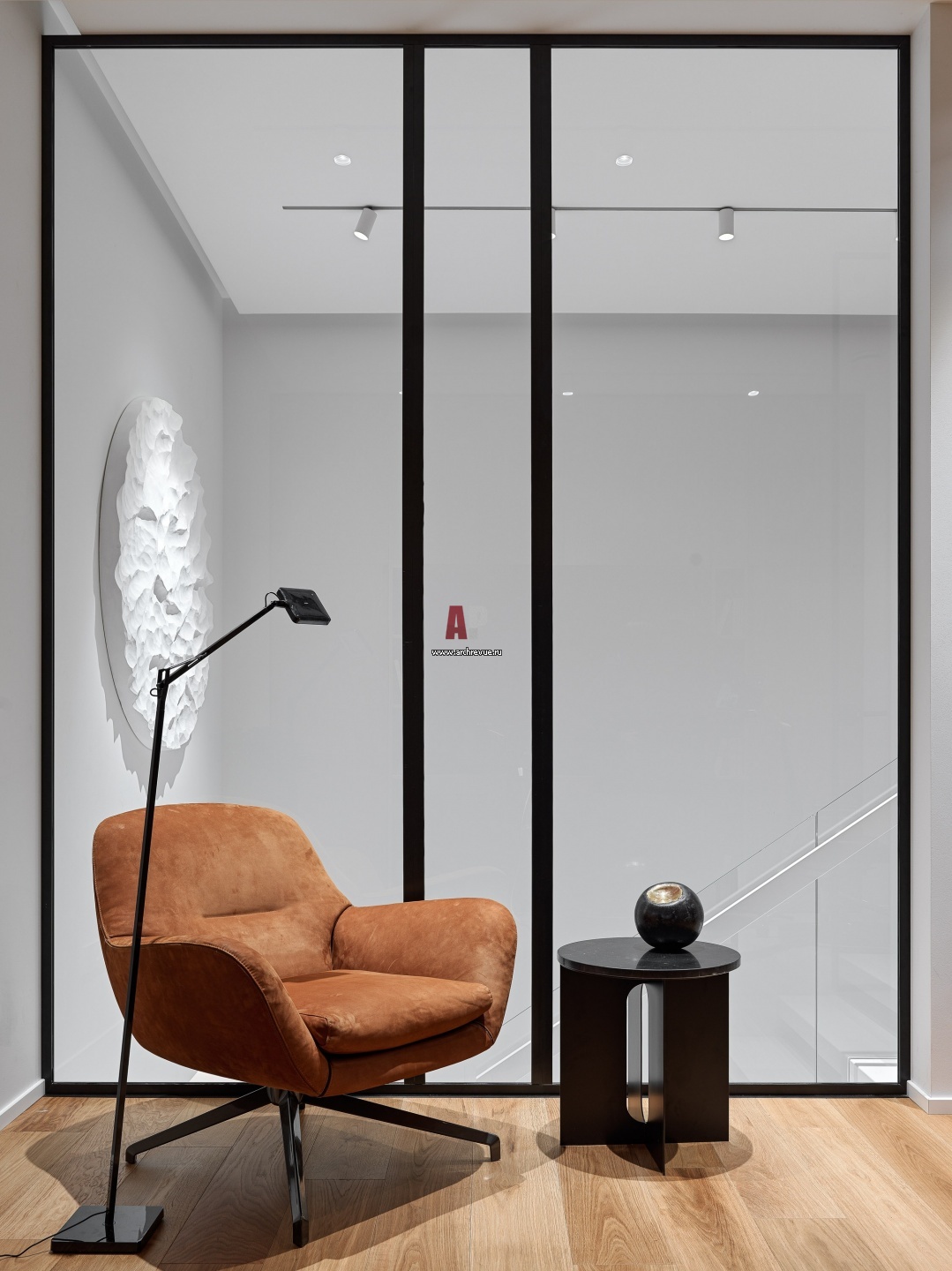 Кабинет размещен в стеклянном кубе, из него открывается вид на лестничный холл. Кресло Minotti, модель Jensen. Торшер, Flos.