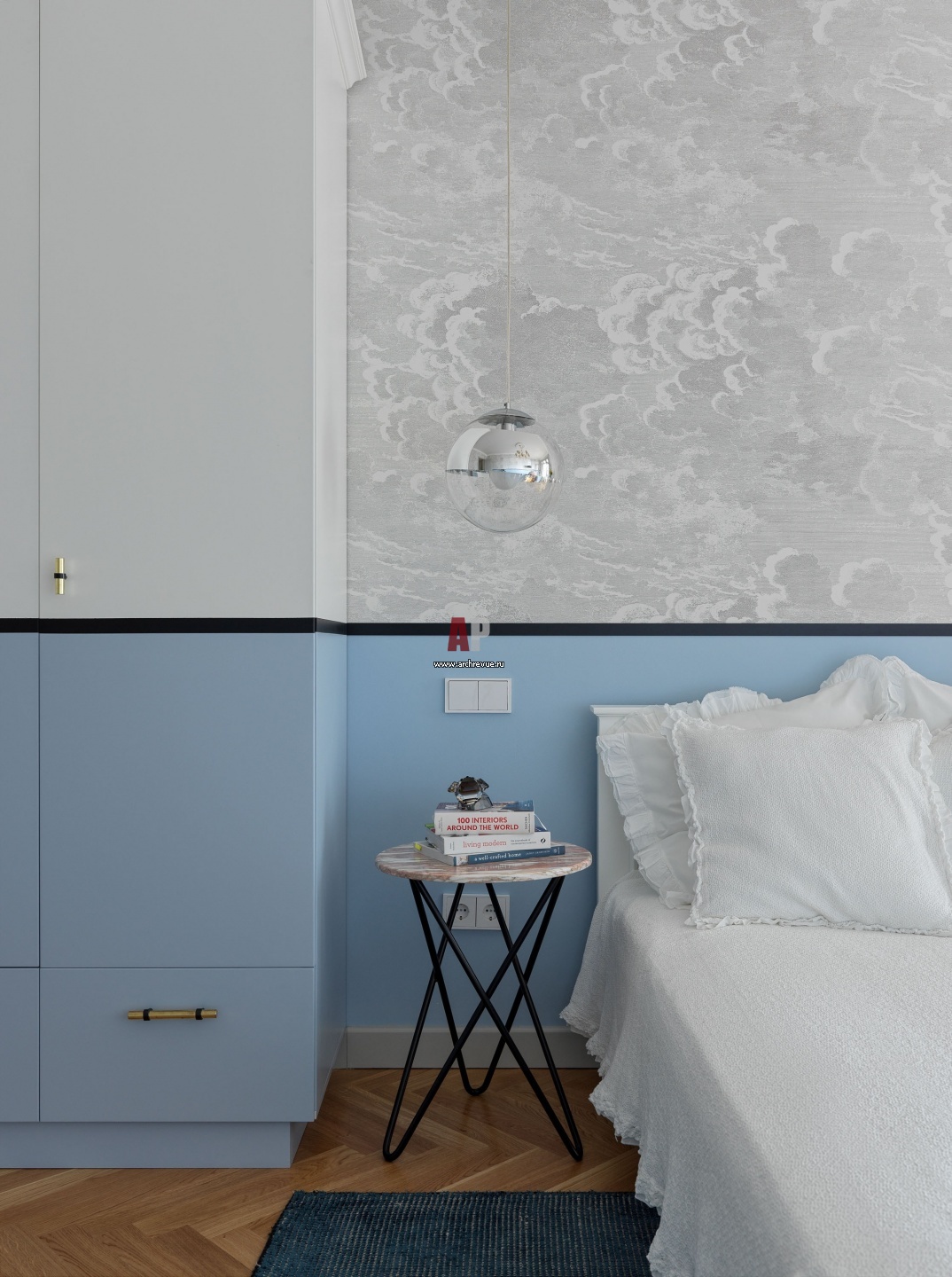 Фрагмент комнаты дочери. Стена оформлена разными материалами: верхняя часть оклеена обоями Cole & Son, нижняя – окрашена краской Tikkurila. Двухчастный декор переходит на встроенный шкаф.