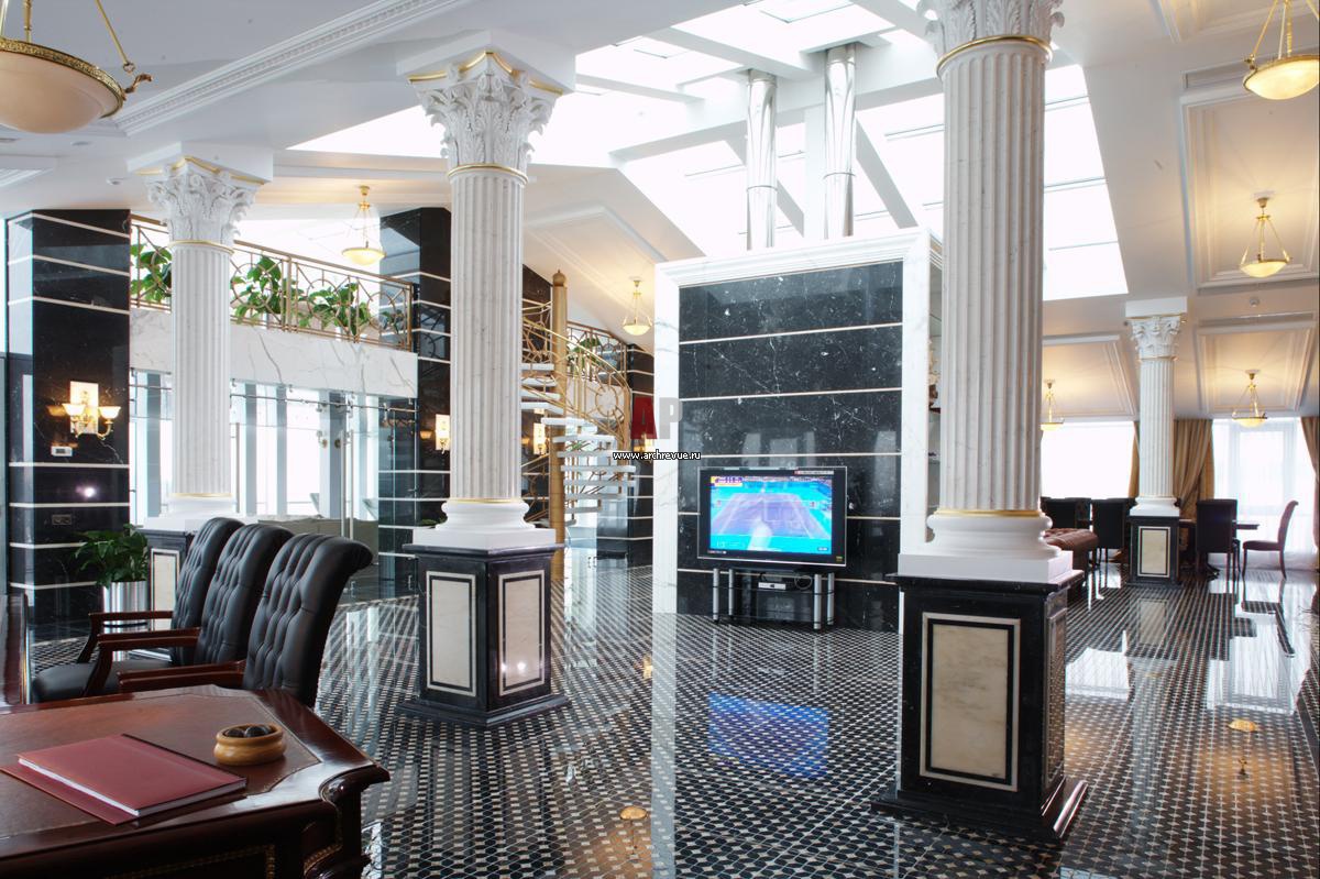 В центре помещения находится панель, облицованная черным мрамором, поставщик «Камнетес». С одной стороны в нее вмонтирован камин, поставщик «Арс-Торг», а с другой – плазменная панель.