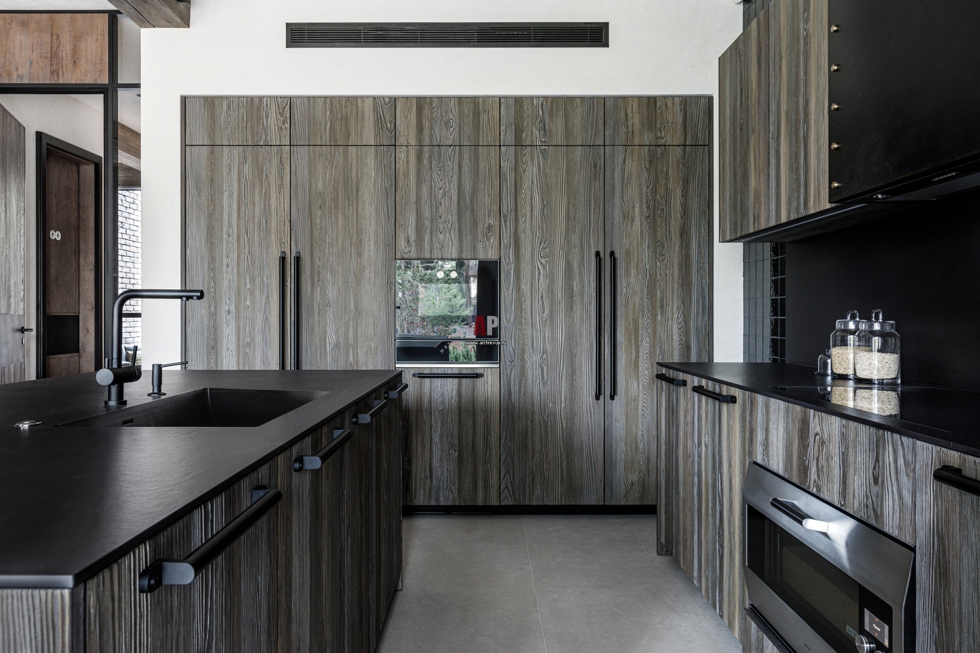Кухня расположена в отдельном помещении за стеклянными перегородками. Кухонная мебель, Boffi. Фасады выполнены из серого дуба.