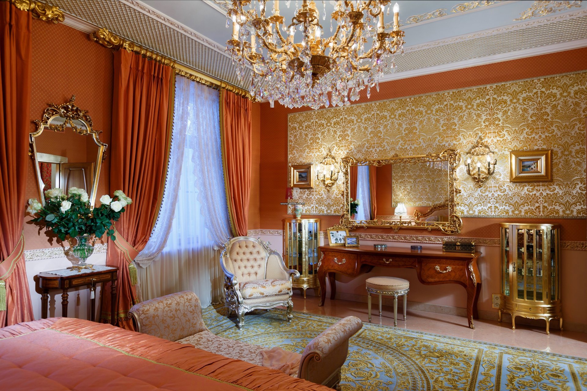 Туалетный столик в дворцовой спальне. Насыщенный декор и теплая колористика придает помещению сходство с роскошными итальянскими интерьерами. Нижний фриз выкрашен в нежный персиковый оттенок, центральная часть оформлена бархатным панно от Zuber.