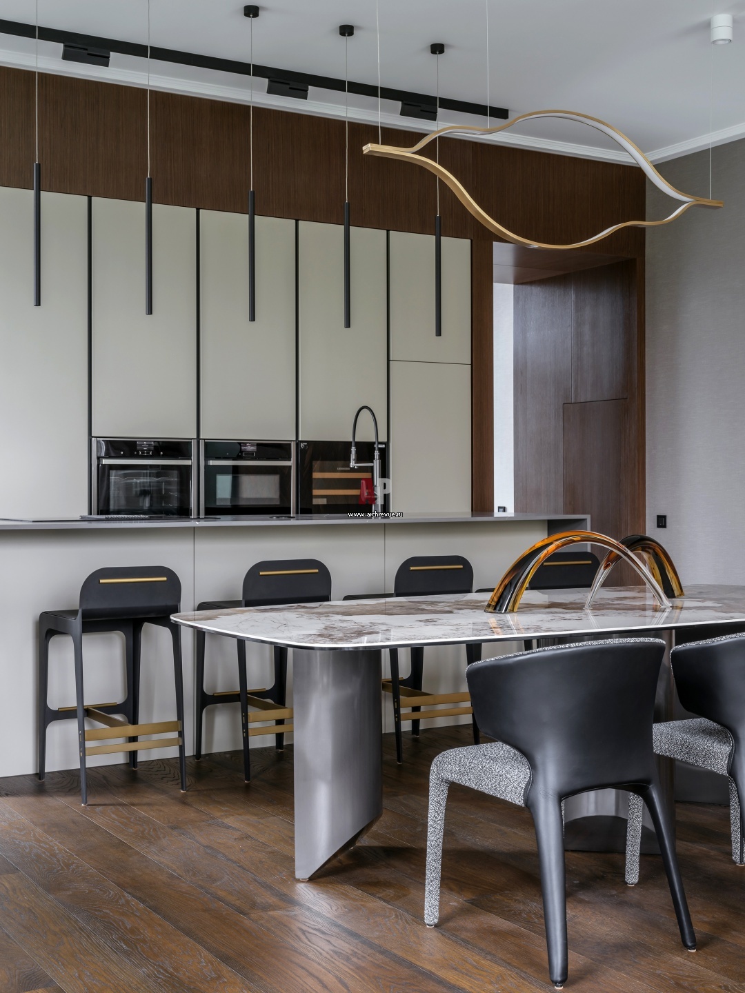 Кухня с островом. На острове использован крупноформатный кварц. Фасады кухни имеют не совсем стандартную ширину – 25 мм, что придает композиции особую монументальность. В каждый ящик и отсек интегрирована LED-подсветка. Светильники над островом в виде тонких цилиндров.