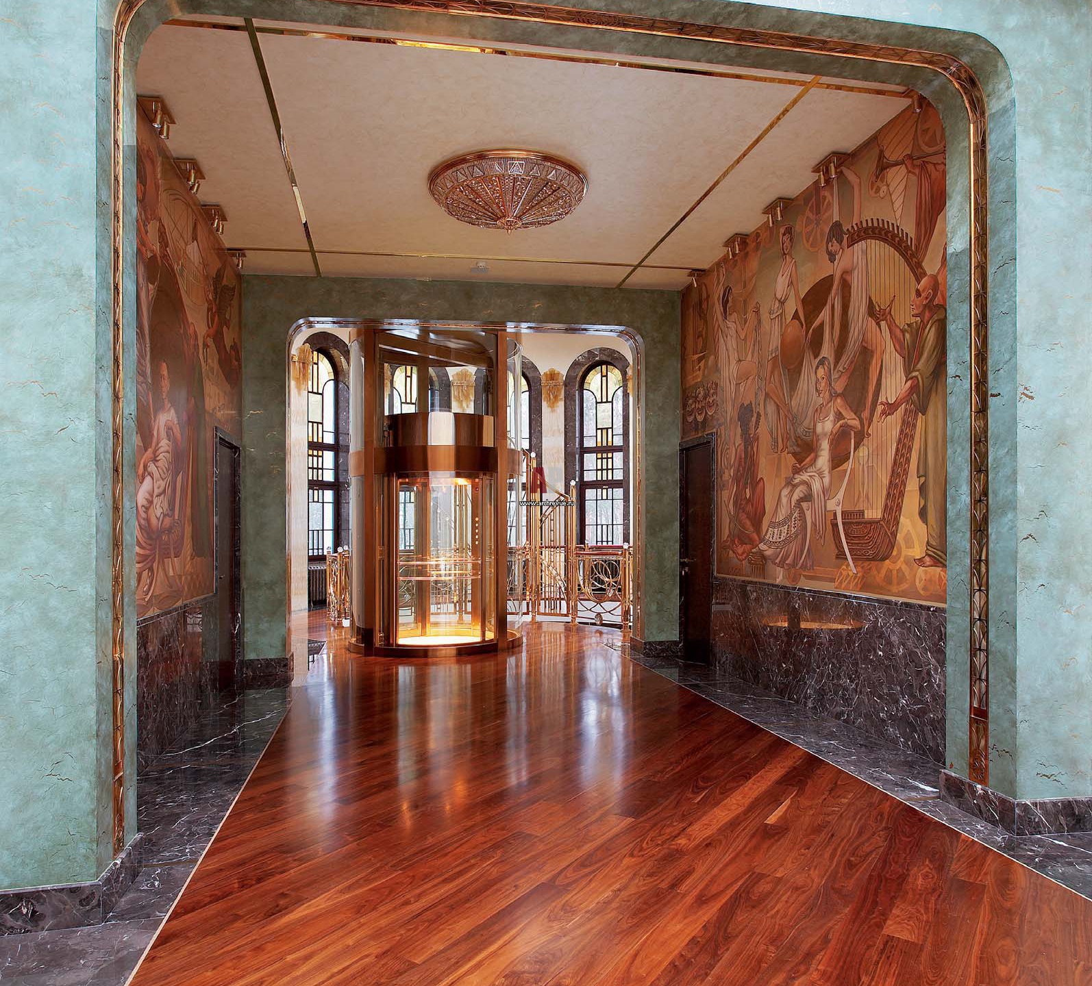 Особняк насыщен декором и ритмичным орнаментом. Галерея в холле второго этажа декорирована росписью работы художника Андрея Воронина. Полы во всех помещениях выполнены из наборного паркета из экзотических пород дерева, поставщик «Паркет-Холл».