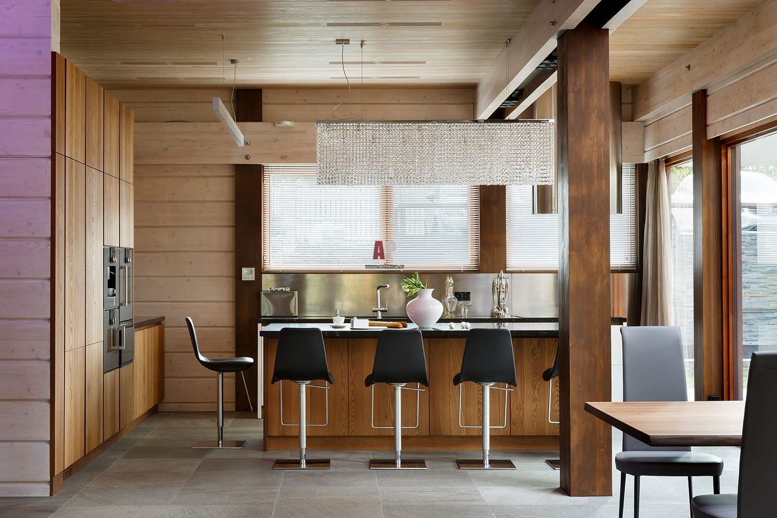 Гостиная, столовая, кухня, каминный зал размещены в едином пространстве, панорамные окна с выходом на улицу призваны растворить интерьер в природном окружении.