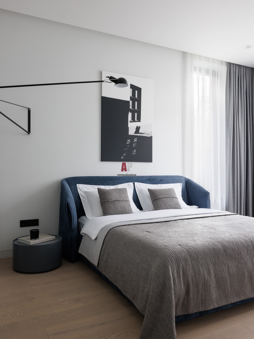 Хозяйская спальня расположена на первом этаже. Кровать, тумба, туалетный столик, Novamobili. Настенный светильник, Flos.