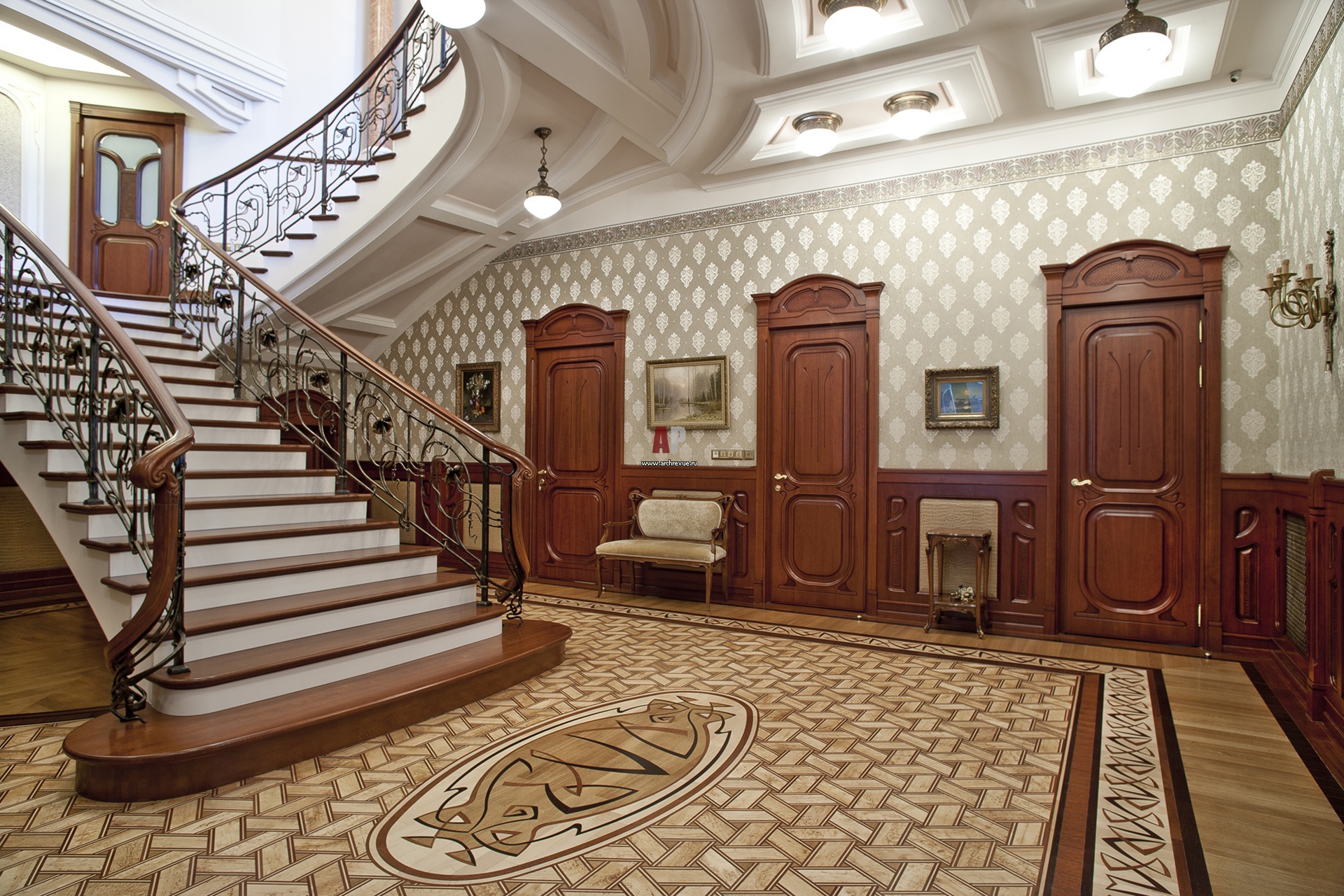 Дизайн холла с лестницей. Декоративный фриз над обоями выполнен из МДФ и оформлен декоративной росписью с серебрением, изготовление PRATTA Exclusive.