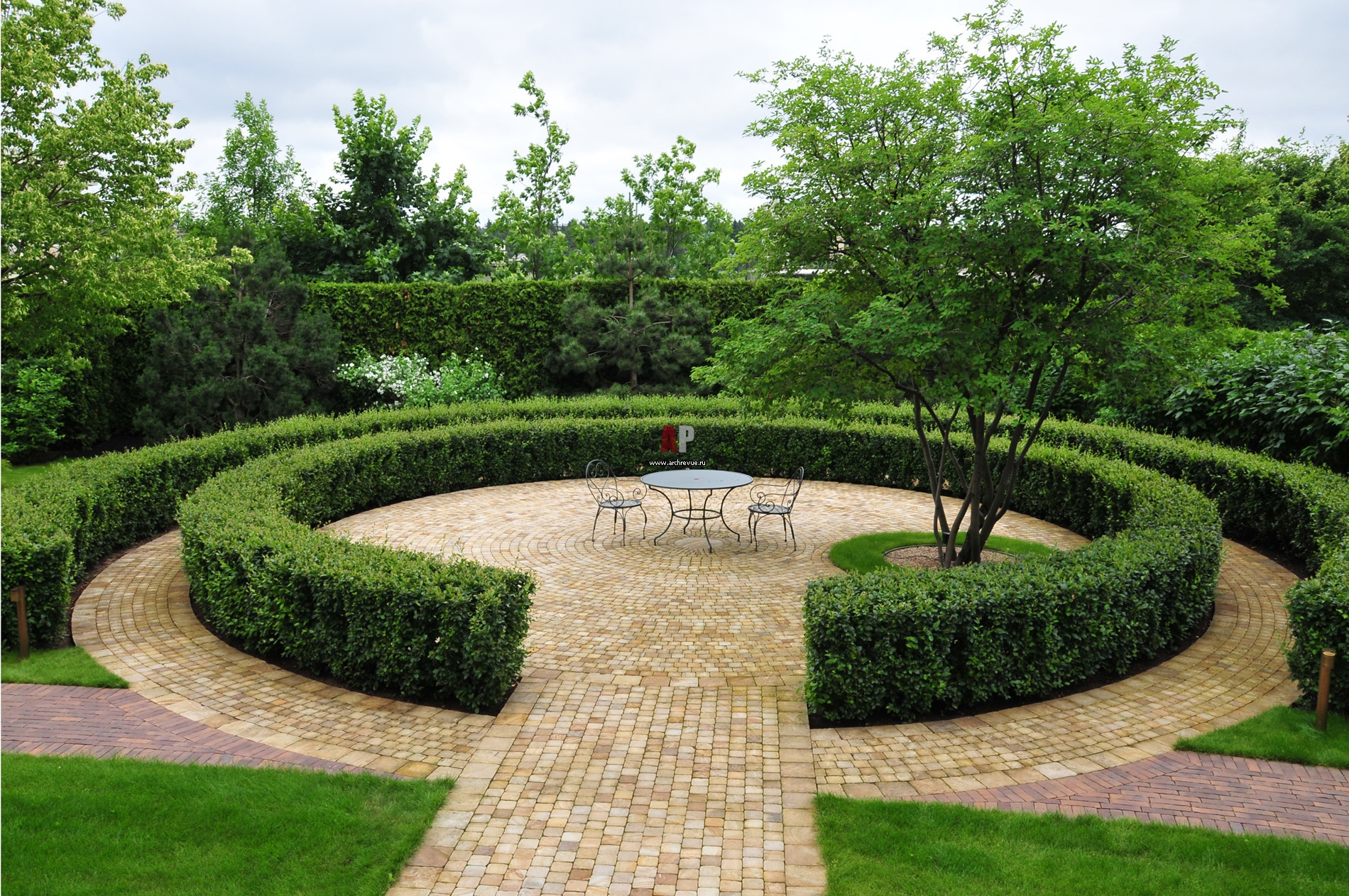 Круглая площадка с бордюрами из стриженого кизильника блестящего (Cotoneaster lucidus) вымощена пиленным индийским песчаником. Этот материал гармонично сочетается с клинкером Hagemeister, которым выложены прогулочные дорожки. В темное время суток они подсвечиваются светильниками Bel Lighting в бронзовой отделке.
