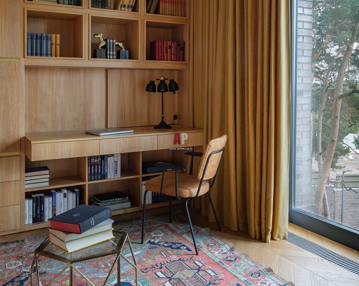 Стеллаж, встроенное рабочее место и стеновые панели выполнены из шпона ореха по эскизам дизайнера. Декор, поставщик Charles.Cameron.