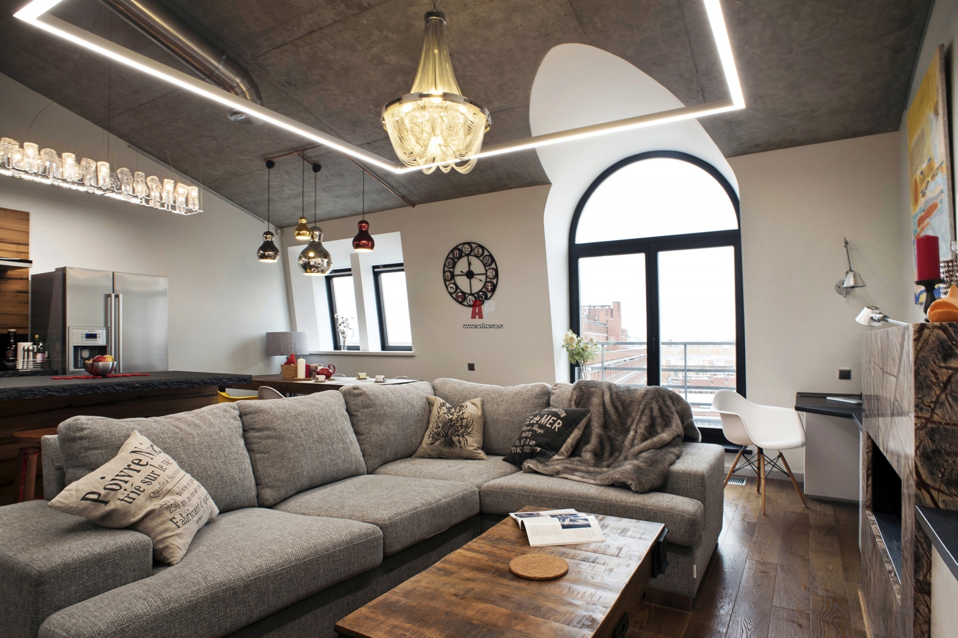 Интерьер гостиной с лофтовой эстетикой. Со светлыми стенами, выкрашенными однотонной краской, контрастирует потолок с фактурой бетона. Потолочная шина придает интерьеру динамику. Журнальный столик, Loft Designe. Встроенные шкафы, стулья, Eames.