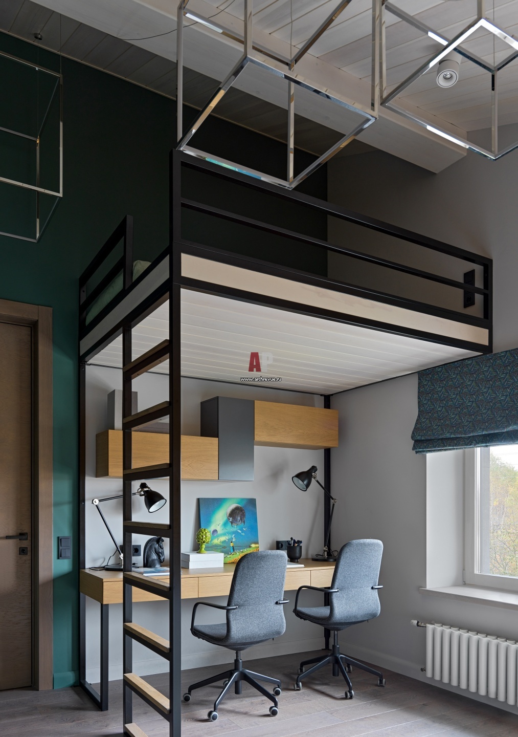 Комната старших сыновей. Сварная консольная кровать из чермета сделана по чертежам автора проекта. Сбоку конструкция оснащена лестницей, внизу разместилось просторной рабочее место для двоих мальчиков. Светильники, Aromas del Campo.