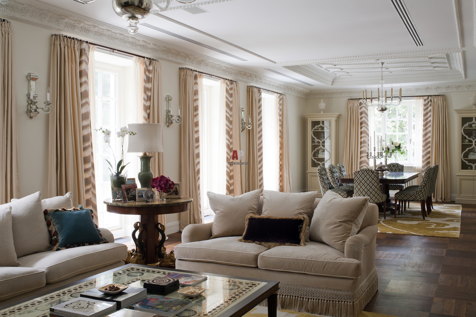 Большой зал (площадью 120 кв. метров) с чередой французских окон объединил гостиную и парадную столовую. Раньше здесь находился бассейн, но заказчики им не и в ходе реконструкции дома от него отказались. Журнальный столик XIX века. Диваны в обивке от Cowtan & Tout сделаны на заказ. Шторы, Brunschwig & Fils.