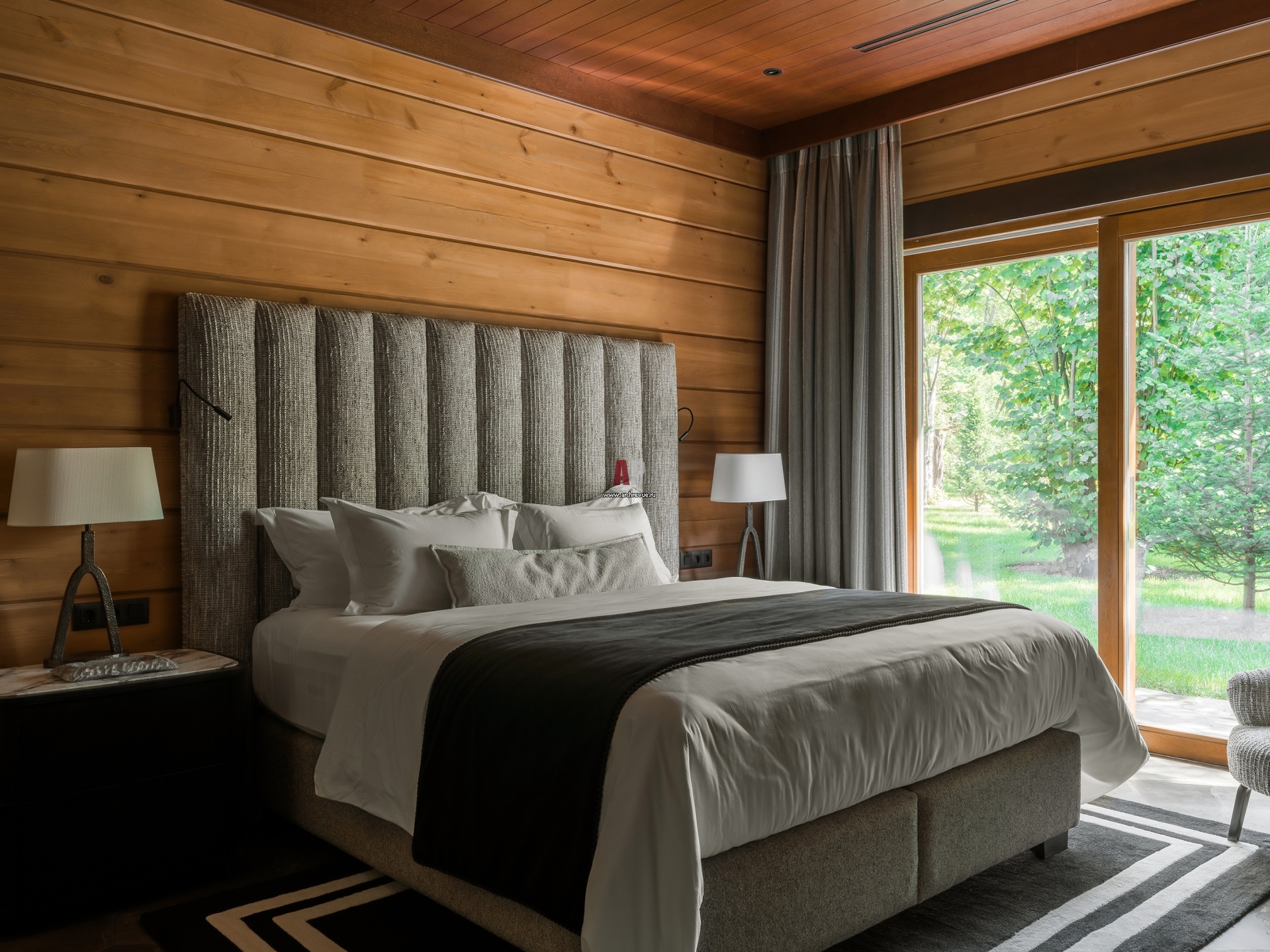 Спальня с панорамным остеклением и выходом в сад. Раздвижные фасадные витражи и изготовлены по технологии HS-Portal. На полу – уличный шлифованный плитняк.