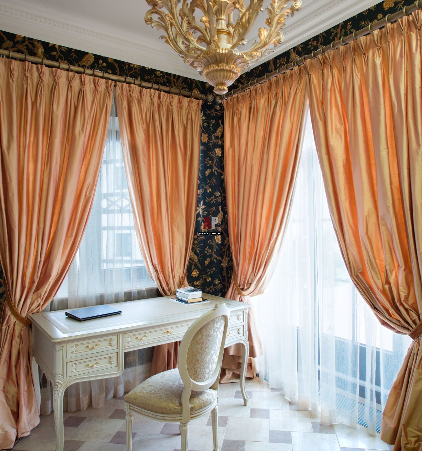 Кабинет исполнен в европейском ключе, без восточных реминисценций. Текстильный дизайн выполнен по эскизам автора проекта.