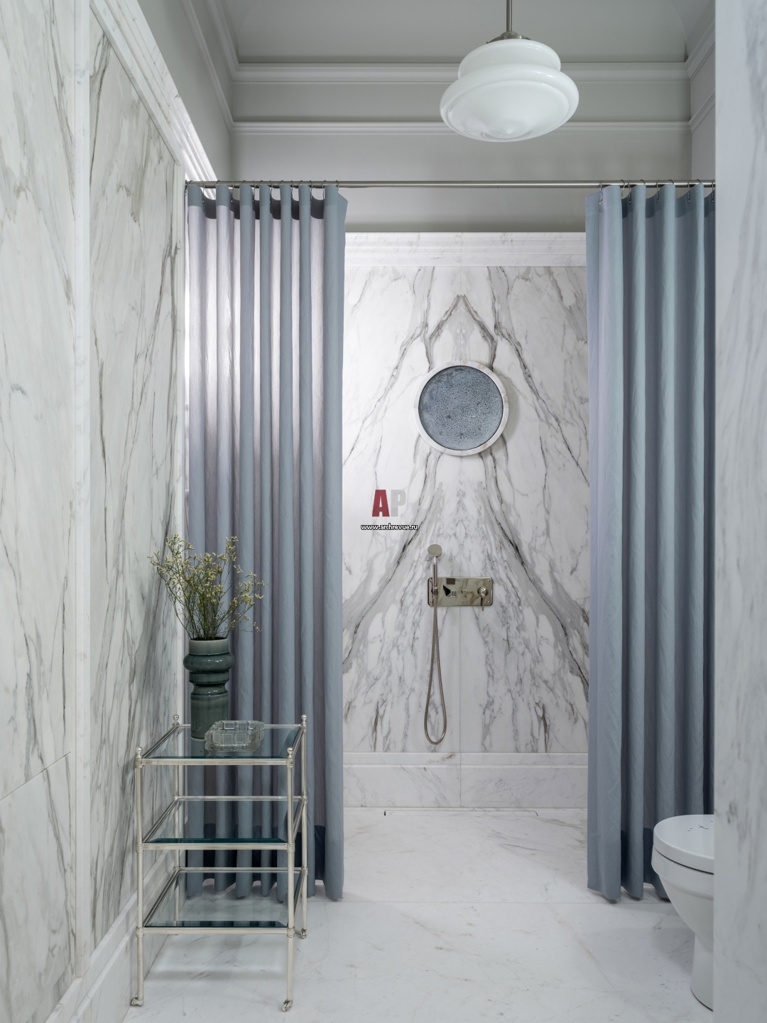 Порталы и стены душевой в женской ванной комнате облицованы мрамором Calacatta Carrara.