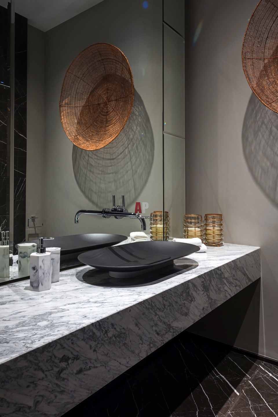 Гостевой санузел. Стены окрашены под бетон. На полу – черный мрамор. Столешница выполнена из серого мрамора, Bianco Carrara.
