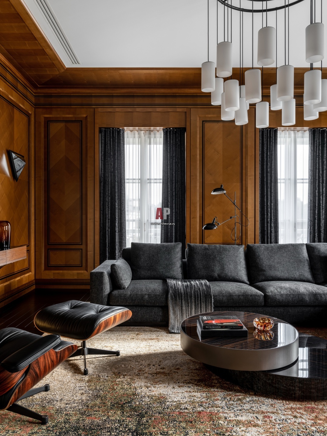 Музыкальная гостиная появилось вследствие увлечения дочери хозяев игрой на пианино, а затем стала местом для семейных просмотров ТВ (ТВ есть только в этой комнате, на кухне и в ванной) и лаунджем. В ее оформлении использованы буазери из шпона клена насыщенного медового цвета. Шторы, Kvadrat.