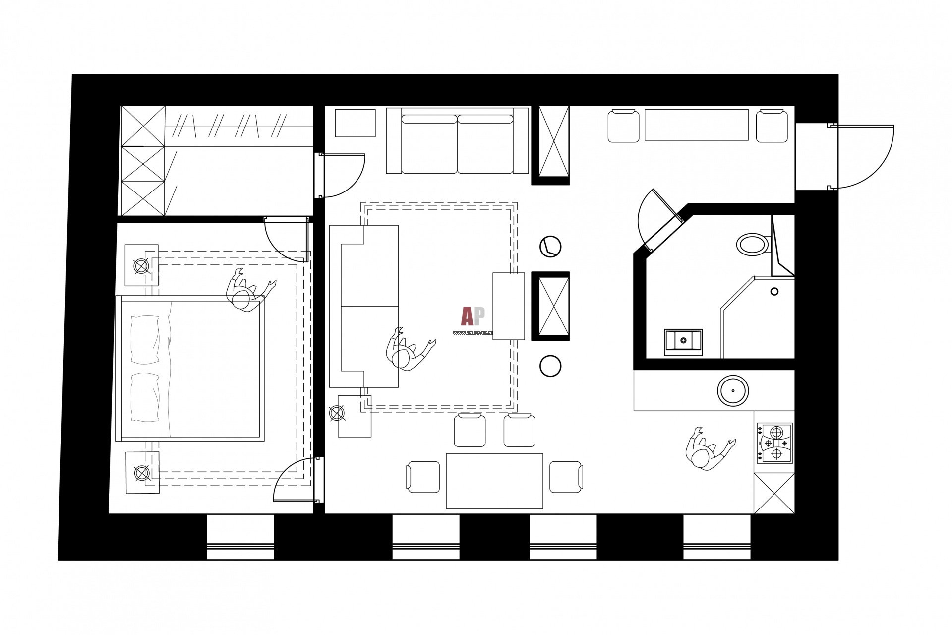Планировка двухкомнатной квартиры для временного проживания семейной пары.