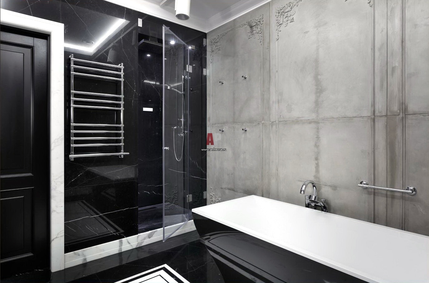Интерьер ванной комнаты квартиры в стиле фьюжн. Стена за ванной отделана панелями из архитектурного фибробетона. Ванна, Villeroy & Boch.