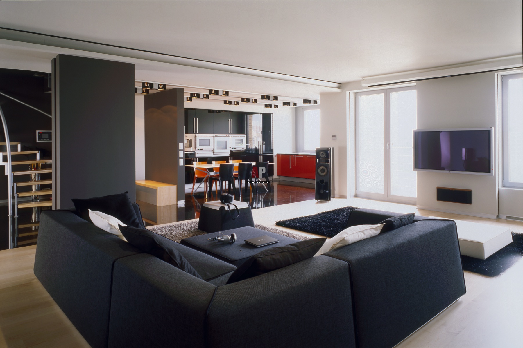 Интерьеры просты и лаконичны. Стены декорированы простыми покрасками. Пол в мягкой зоне выложен массивной доской из беленого ясеня, поставщик «Осмо-М», в кухне-столовой – черным крупноразмерным керамогранитом, поставщик «Джиель».