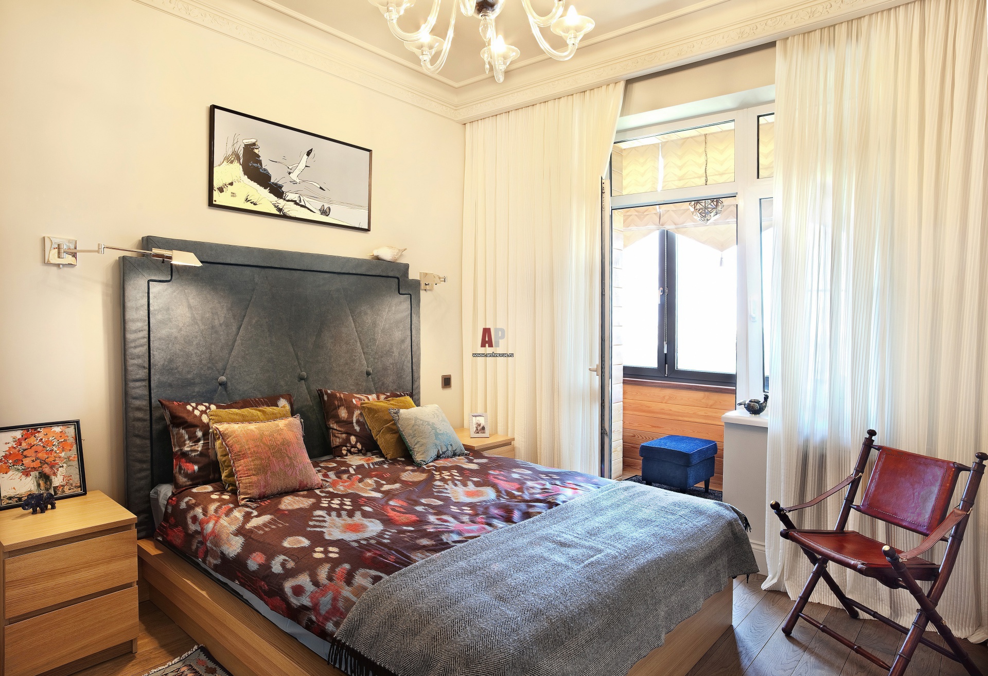 Спальня в квартире изолированная. Интерьер выполнен в легких теплых тонах. Высокое изголовье кровати обито серой искусственной замшей. Постер над кроватью работы Уго Пратта привезены из Парижа.
