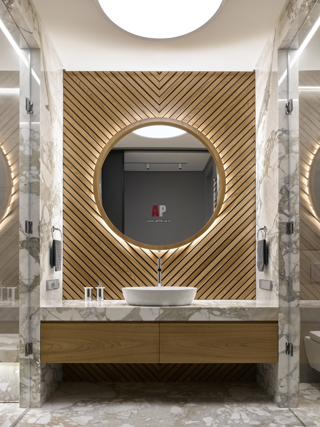 Хозяйская ванная комната. На стене за умывальником – панно из термоясеня. Натуральный мрамор, Arabescato Vagli. Раковина, Villeroy & Boch, модель Artis. Освещение, Centrsvet.