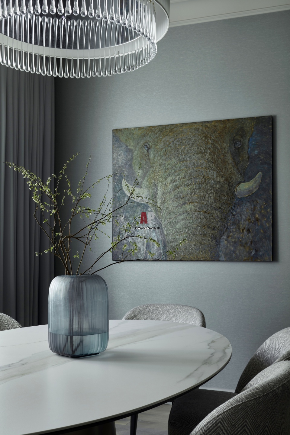 Квартира со сложной светлой палитрой и тактильными фактурами. Люстра, Heathfield & Co. Картина Эдуарда Абжинова. Ваза, Guaxs.