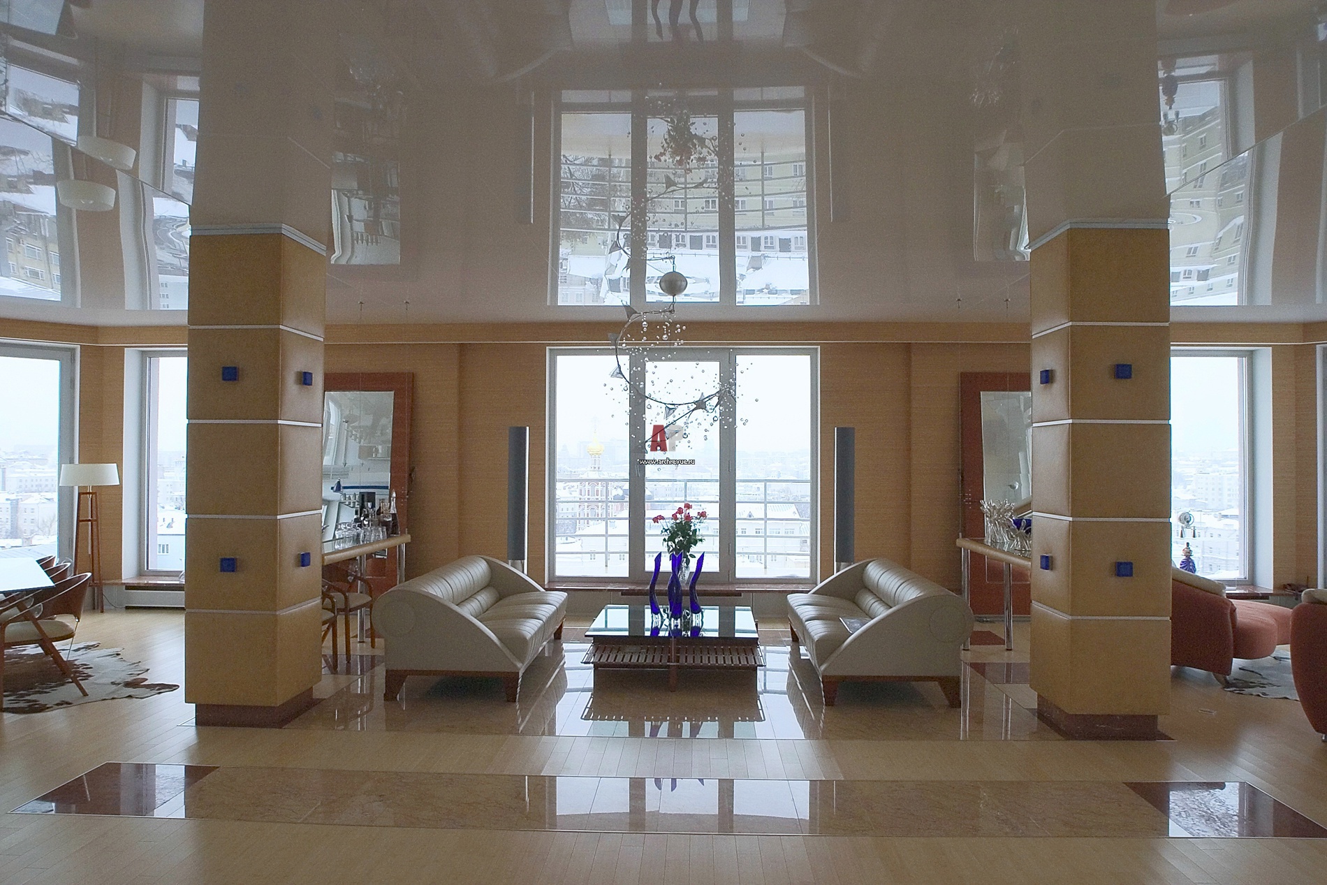В общественной зоне квартиры практически сохранена свободная планировка. Заказчикам хотелось большого, свободного перетекающего пространства, минимум перегородок и мебели, много стекла. Акцент гостиной – большое панорамное остекление с видом на центр Москвы, не загороженным никакими шторами.