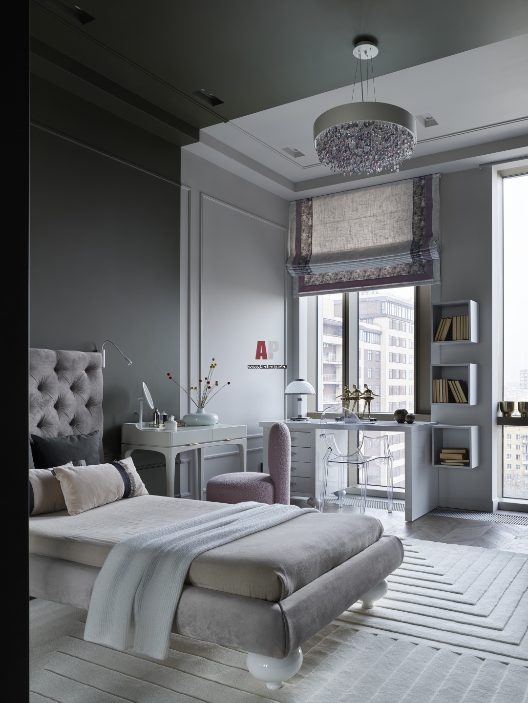 Комната дочери получилась самая светлая и современная по дизайну. Кровать и письменный стол, NeopolisCasa. Люстра, Masiero, модель Ola.