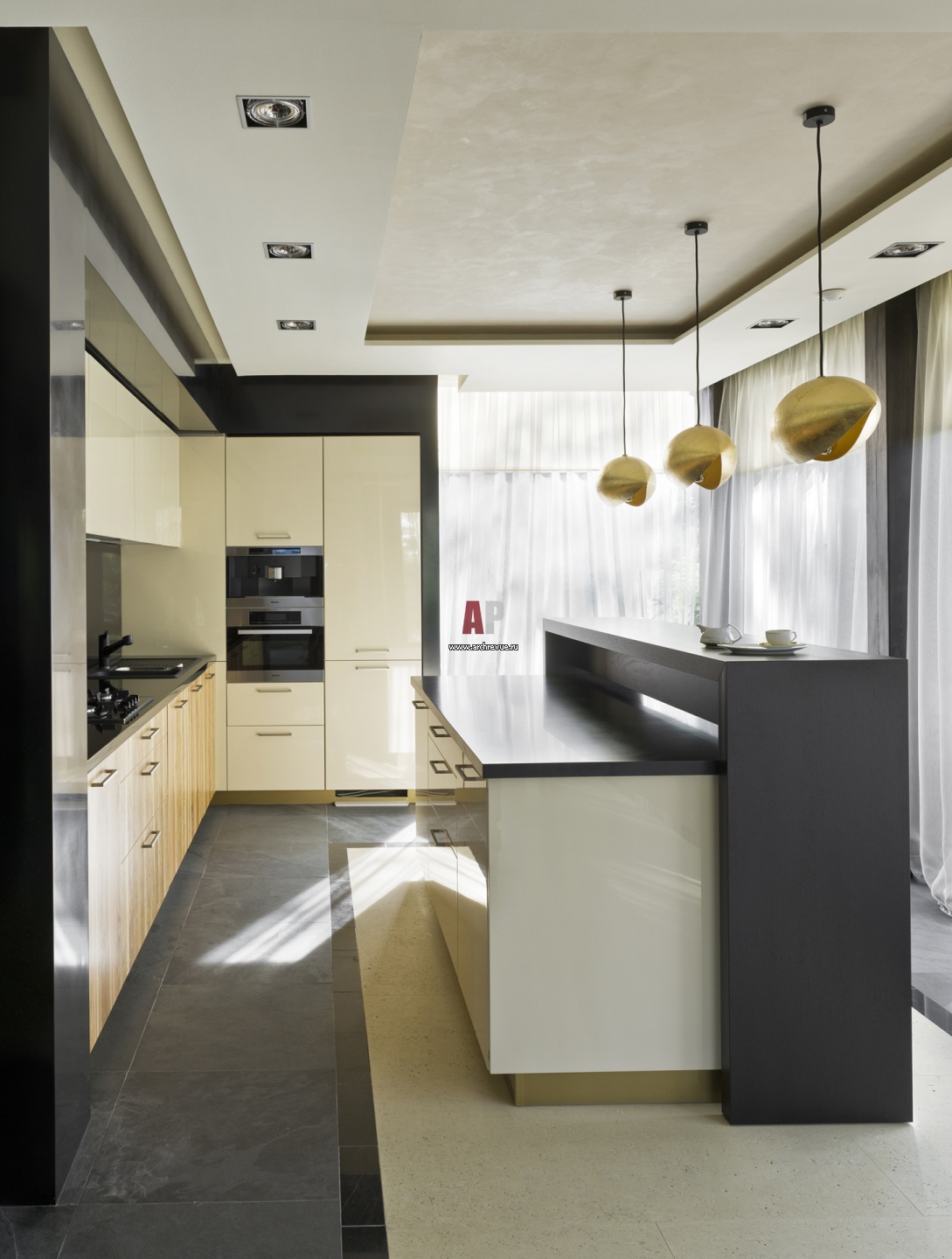Интерьер кухни с П-образной барной стойкой. Над ней – светильники-ракушки от Catellani & Smith, покрытые сусальным золотом.