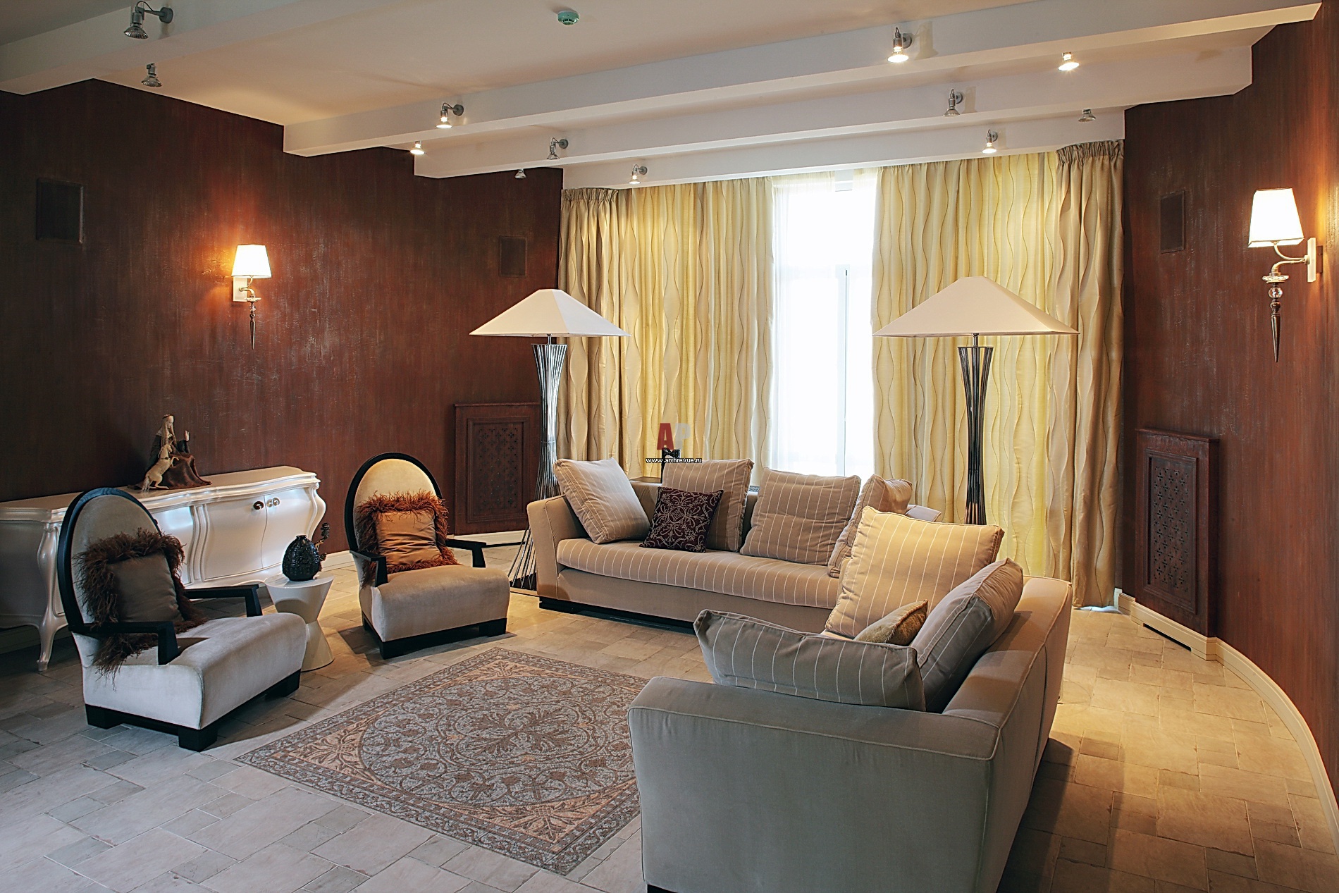Одна из стен в гостиной имеет полукруглую форму. На ней переливы многослойного финишного покрытия цвета бронзы с терракотой выглядят очень эффектно.
