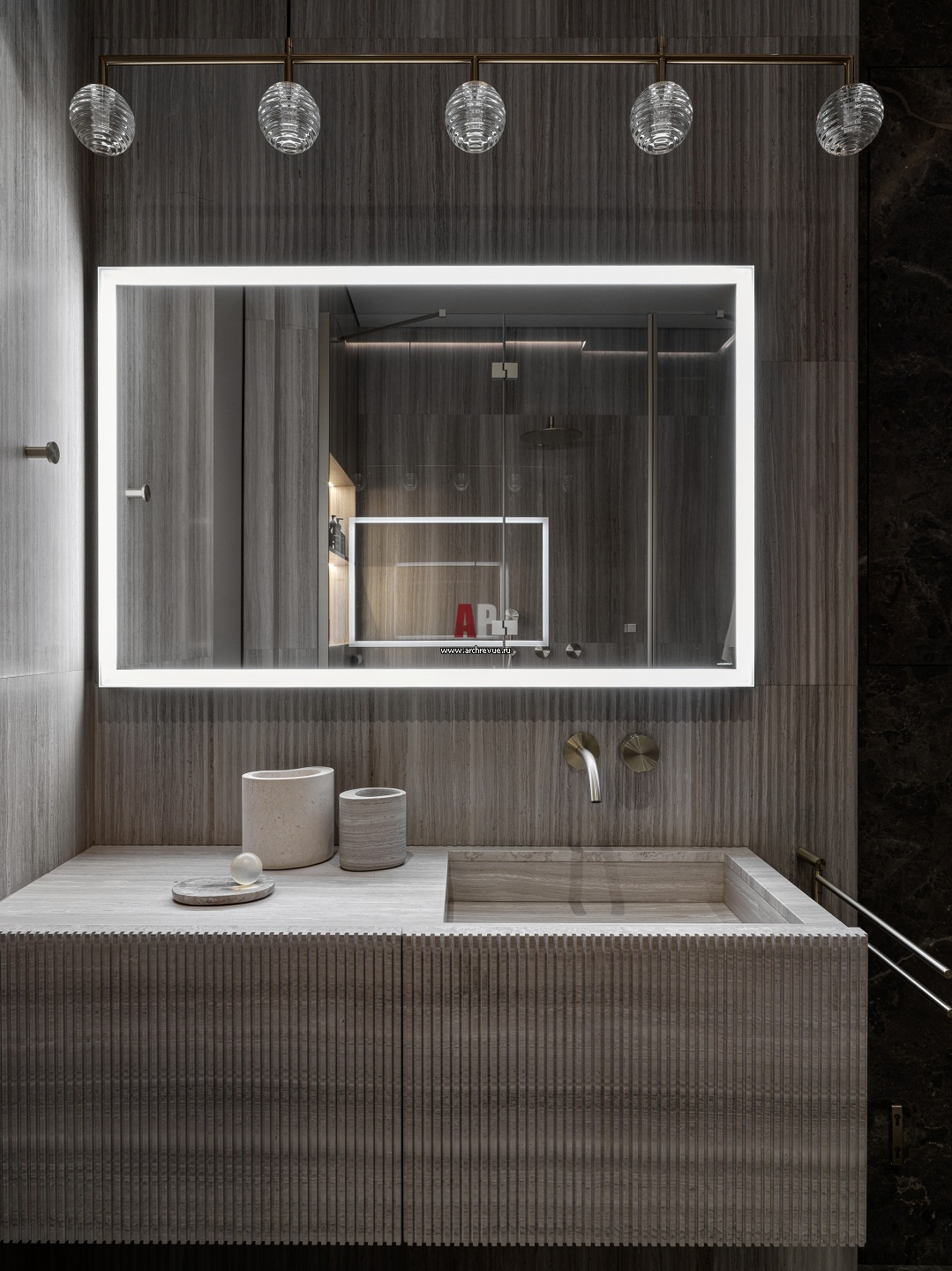 Интерьер санузла в отделке фрезерованным камнем. Мраморная раковина, Salvatori. Зеркало, Antonio Lupi. Подвес над раковиной, Aromas del Campo.