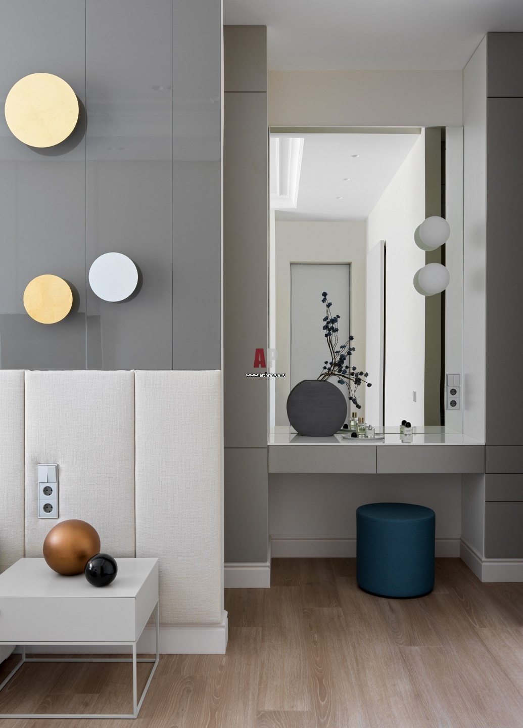 Проходная гардеробная с макияжным столиком находится за изголовьем кровати. Пуф, Vitra, модель Visiona Stool.