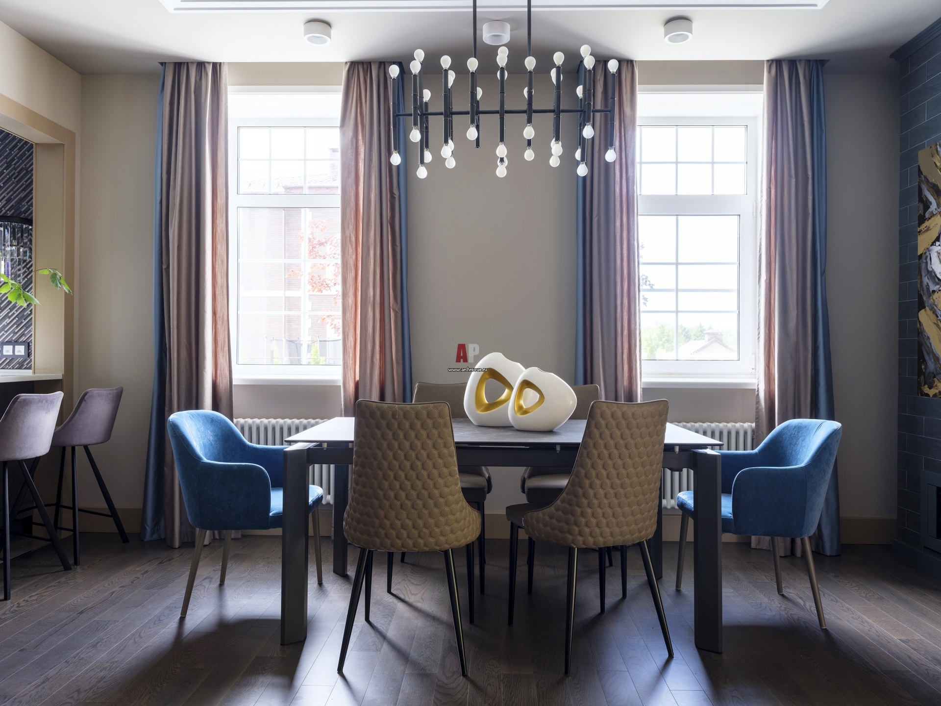 Столовая с большим обеденным столом – одно из основных пожеланий заказчиков. Обеденный стол, Pranzo, модель Track. Стулья, Pranzo, модель Amalfi. Светильник, Jonathan Adler.