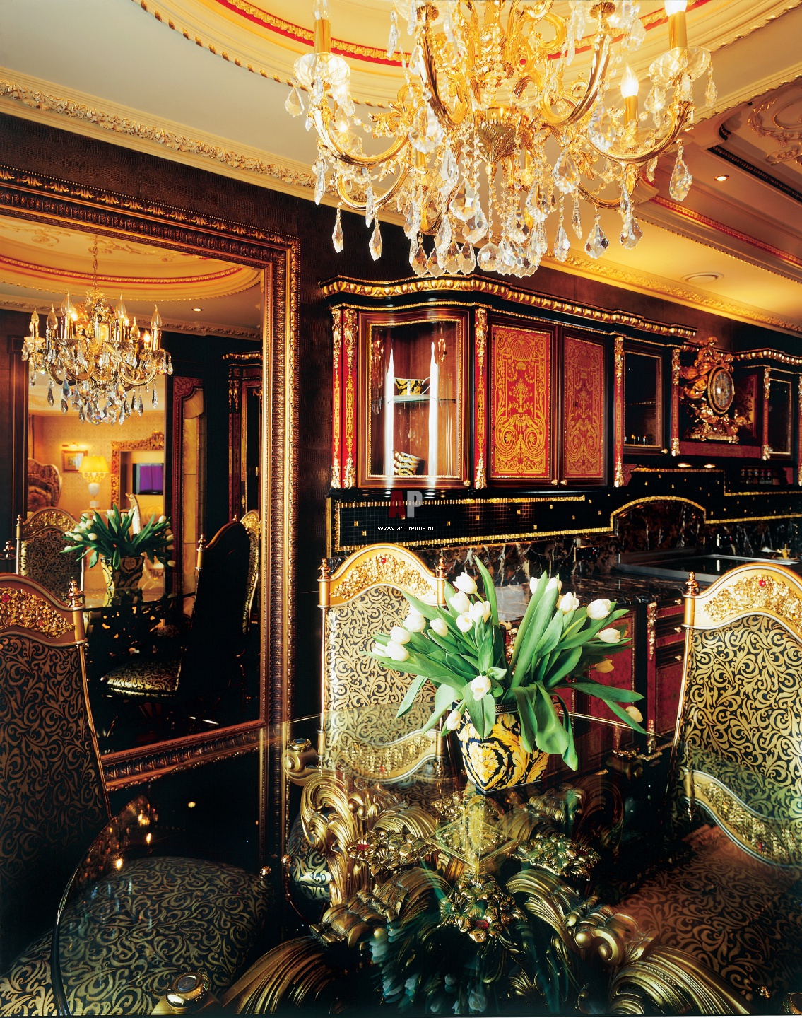 Кухонный гарнитур в технике «буль». Этой техникой владеет считанное количество мастеров по всему миру: за основу берется панцирь черепахи, потом в него врезаются латунные элементы декора. Люстра, Faustig.